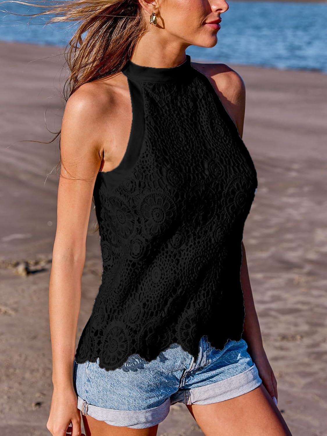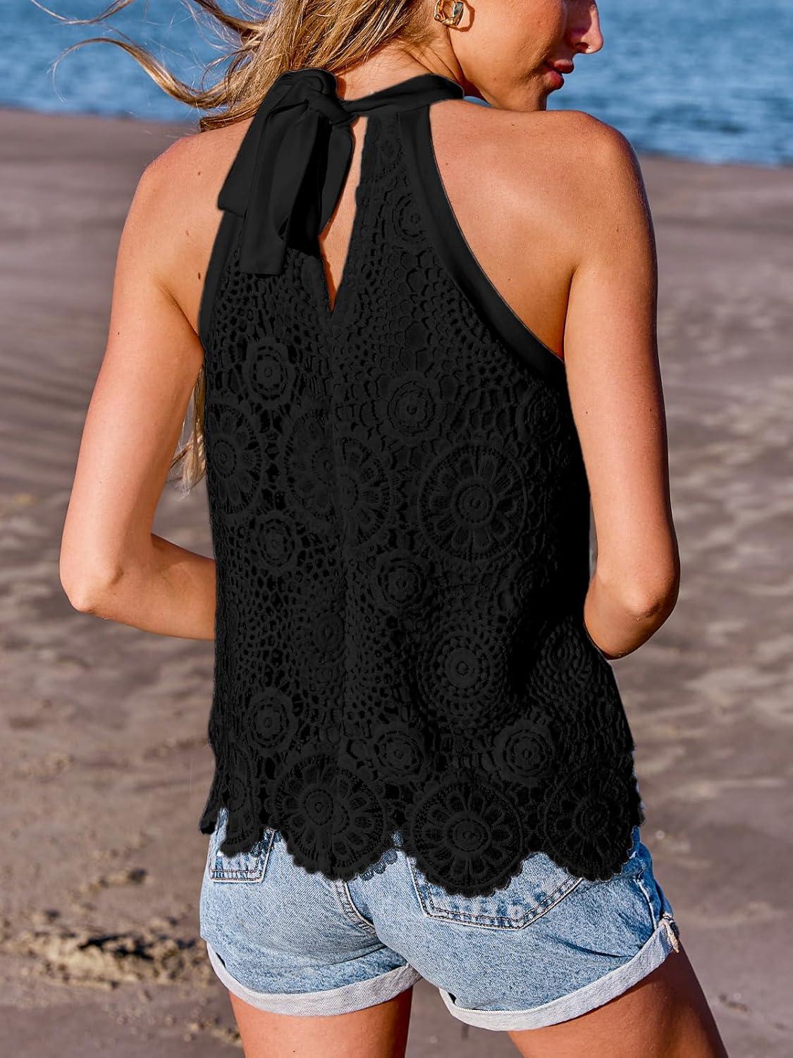 CUPSHE Women’s Tank Tops Hollow Out Lace Boho Blouse Eyelet Embroidery Sleeveless Tops Shirts(Black)