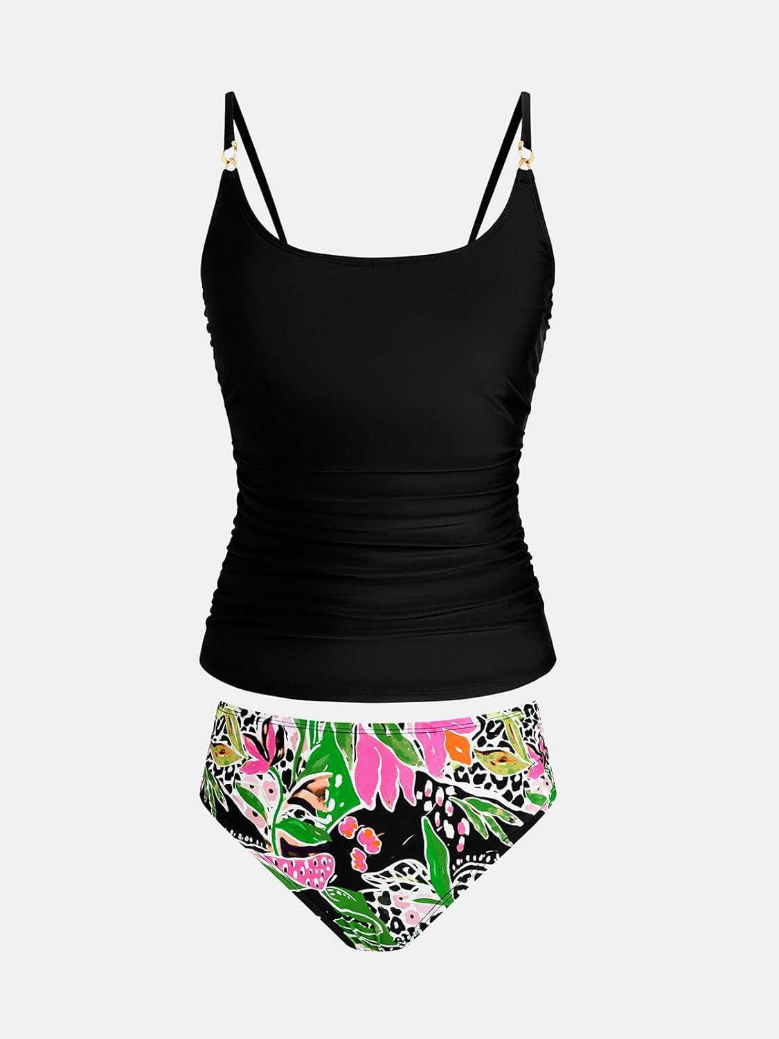 CUPSHE Women’s Tankini Sets Two Piece Swimsuit Scoop Neck Self Tied Crisscross Bathing Suit Ruched Tummy Mid Rise(Black Floral)