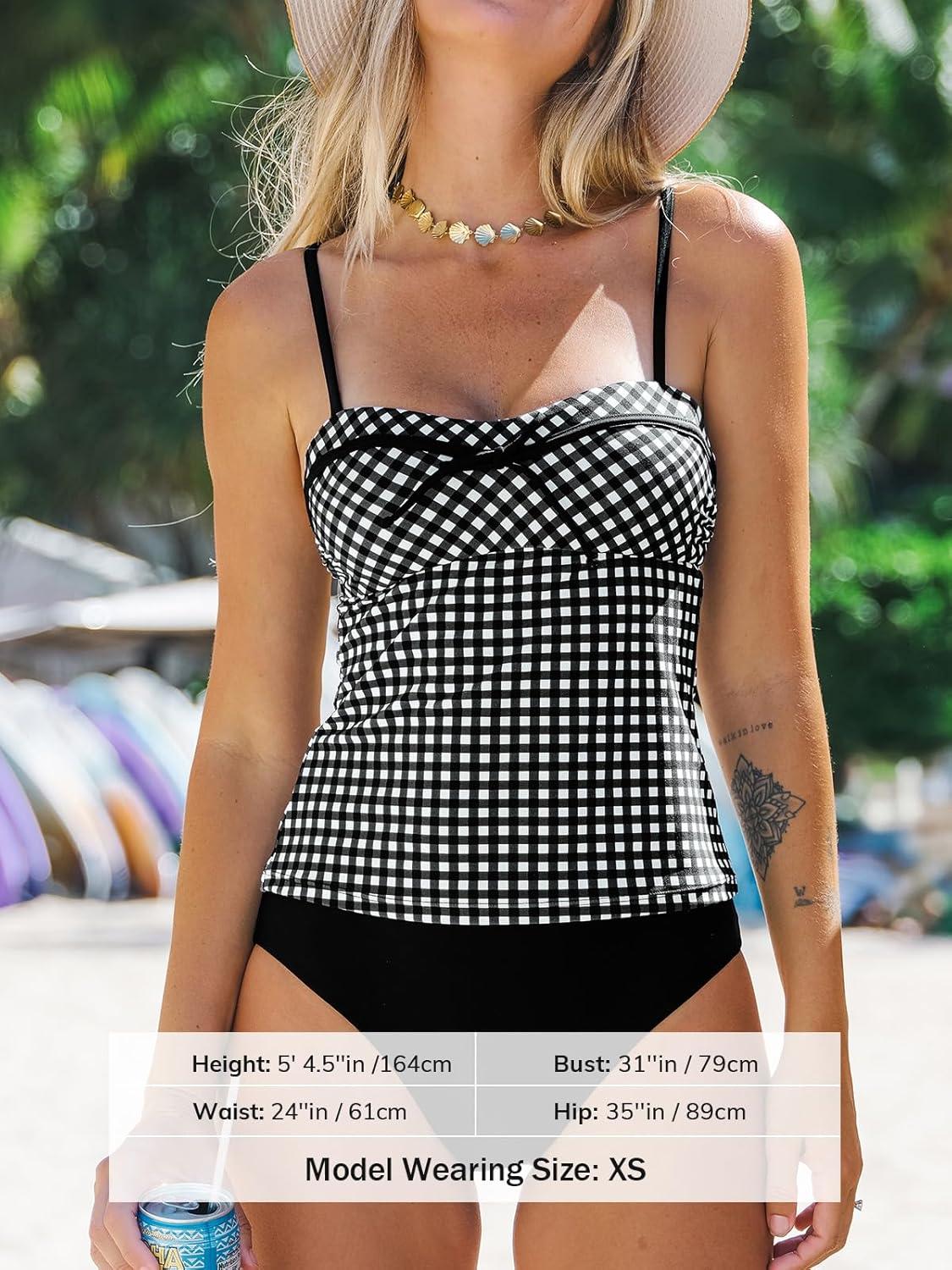 CUPSHE Women’s Tankini Sets Two Piece Swimsuit Sweetheart Neck Bathing Suit Cutout Back Adjustable Straps Mid Rise(Black/White Plaid)