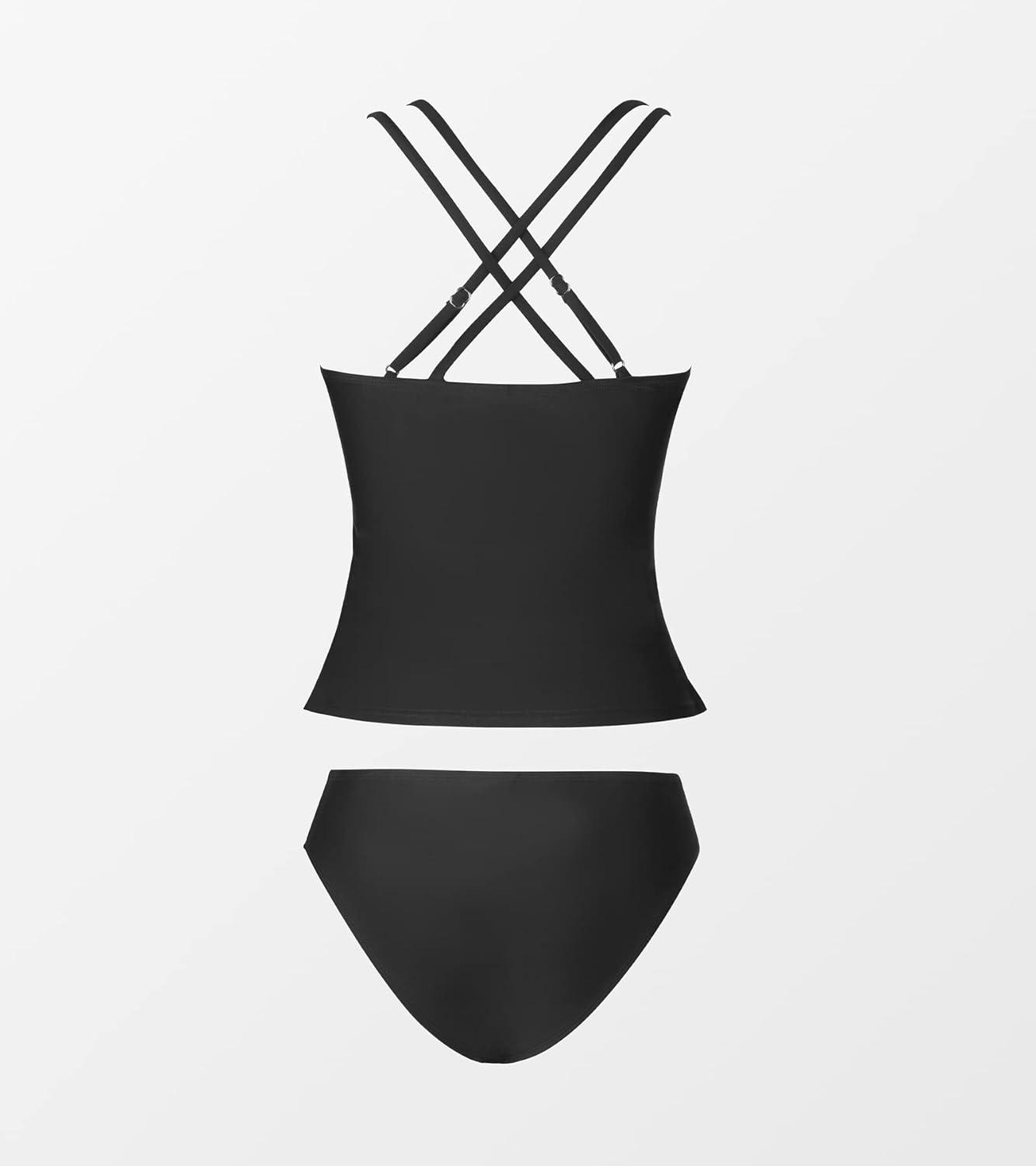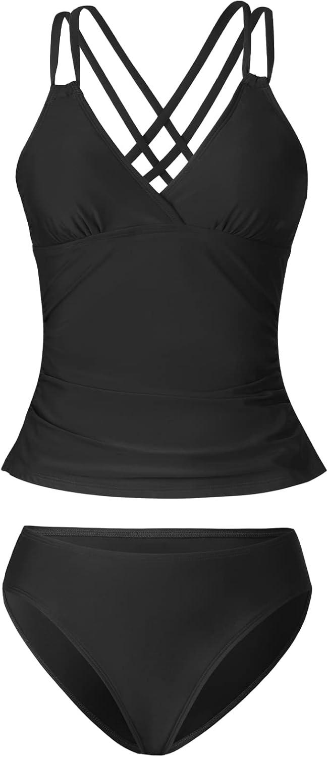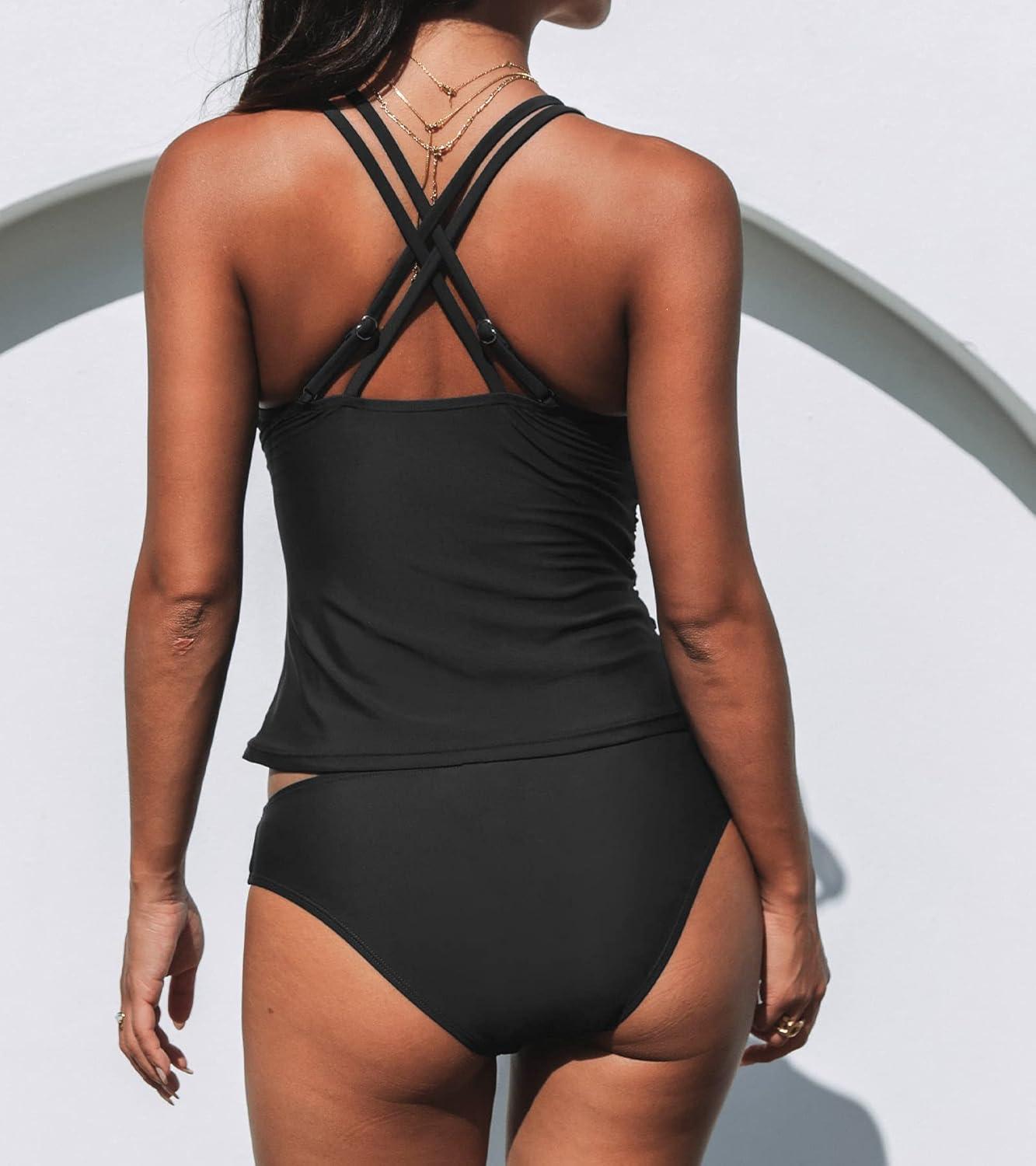 CUPSHE Women’s Tankini Sets Two Piece Swimsuit V Neck Crisscross Adjustable Double Straps Ruched Mid Rise(Black)
