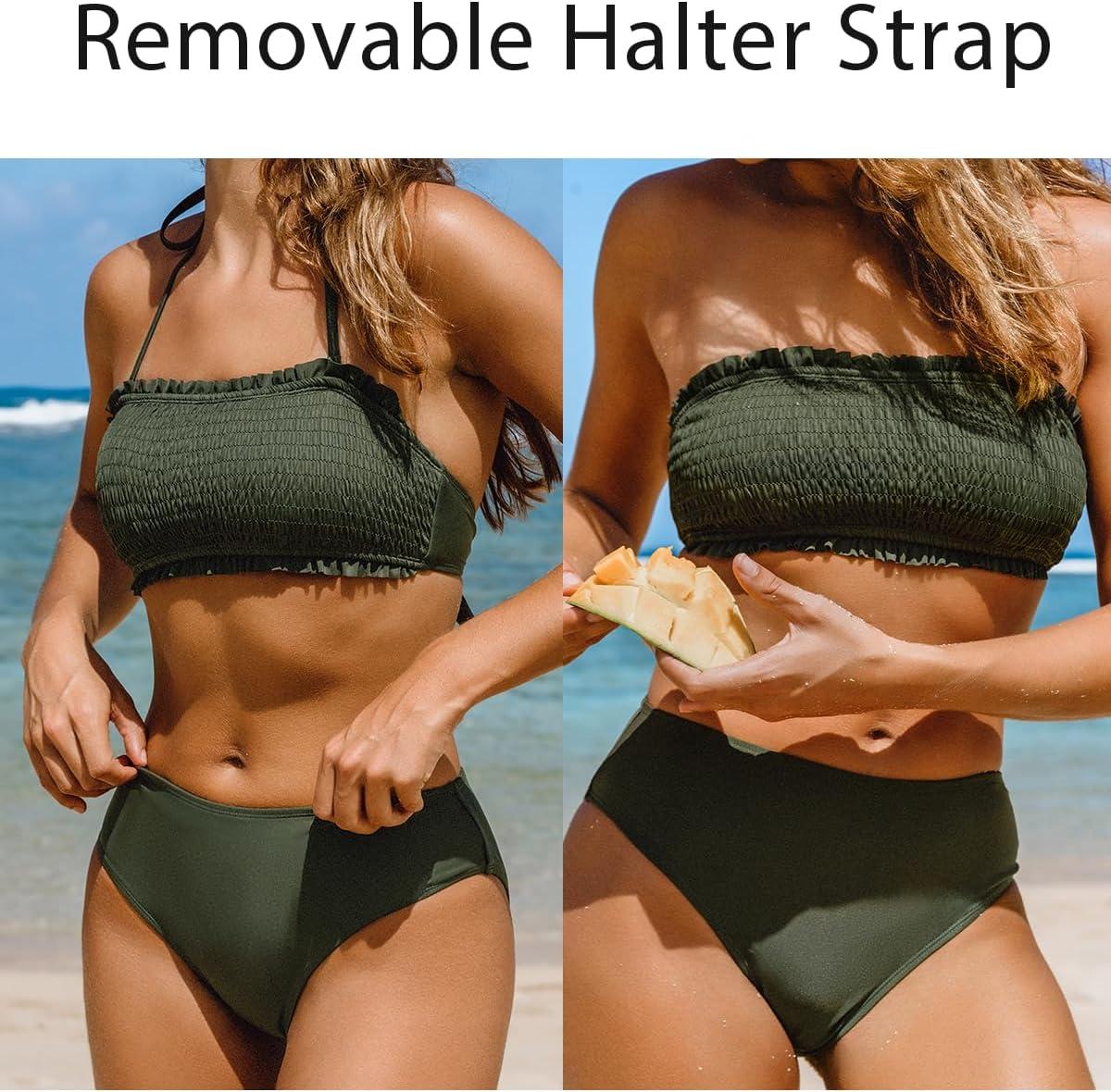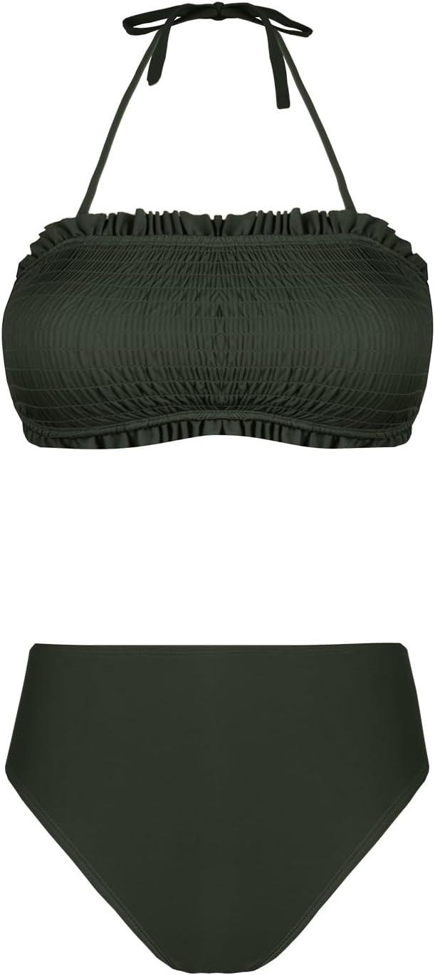 CUPSHE Bikini Set for Women Two Piece Swimsuit Bandeau Top Back Tie Mid Waisted Bottom with Removable Shoulder Straps(Army Green)