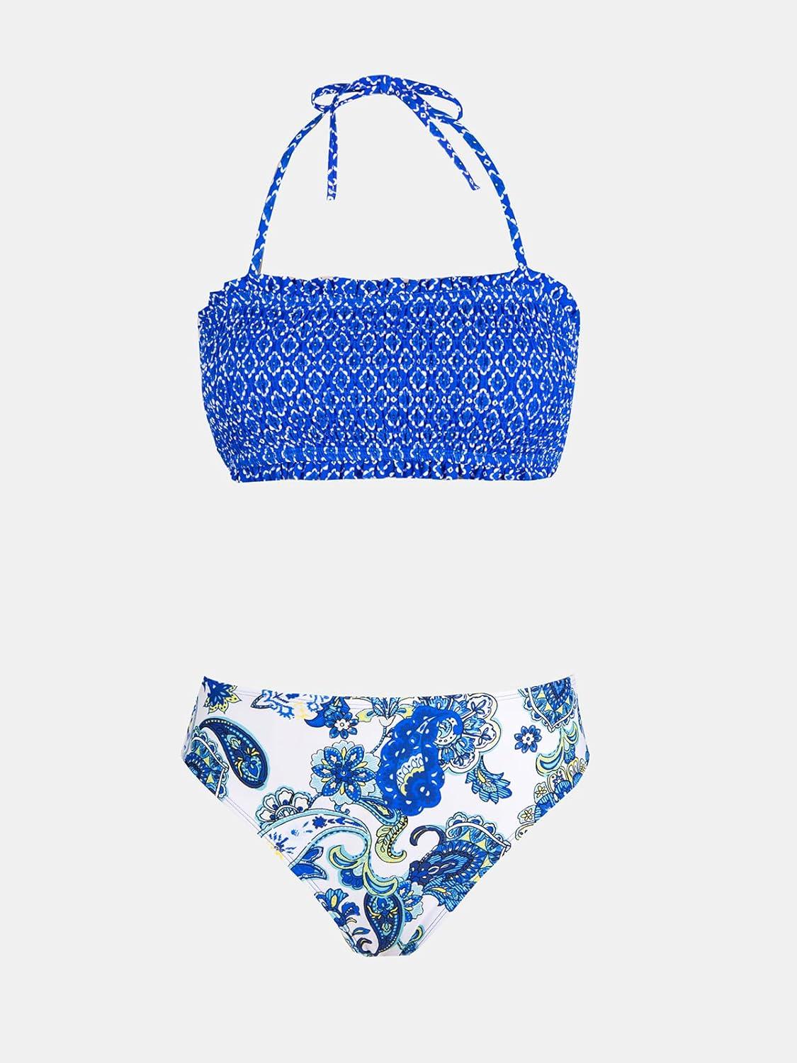 CUPSHE Bikini Set for Women Two Piece Swimsuit Bandeau Top Back Tie Mid Waisted Bottom with Removable Shoulder Straps(Blue Paisley)