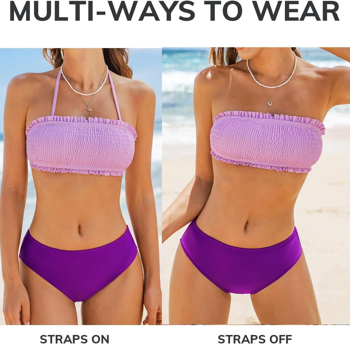 CUPSHE Bikini Set for Women Two Piece Swimsuit Bandeau Top Back Tie Mid Waisted Bottom with Removable Shoulder Straps(Lavender/Dark Purple)