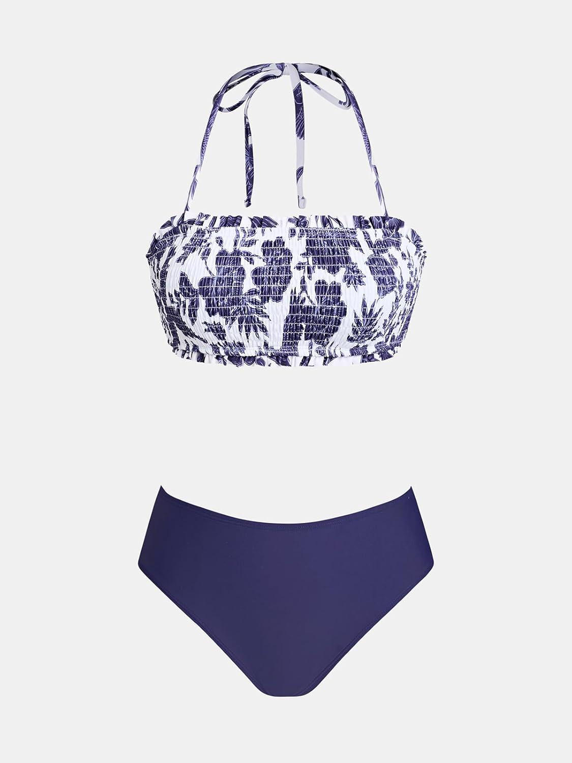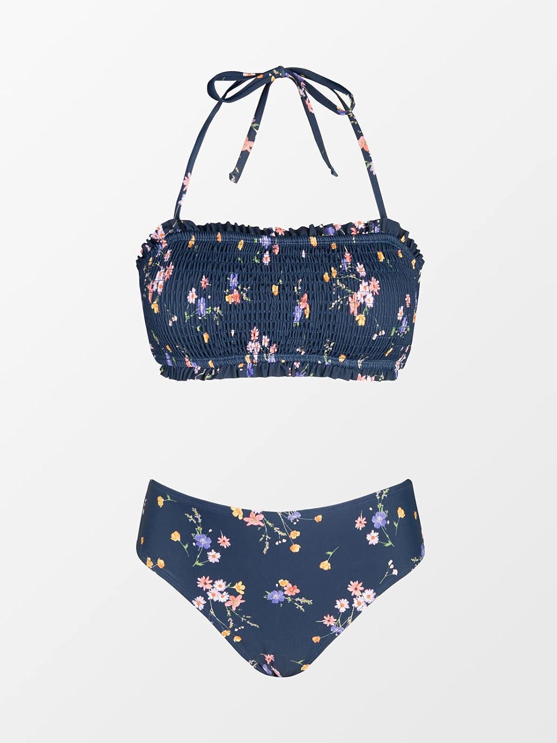 CUPSHE Bikini Set for Women Two Piece Swimsuit Bandeau Top Back Tie Mid Waisted Bottom with Removable Shoulder Straps(Navy Floral)