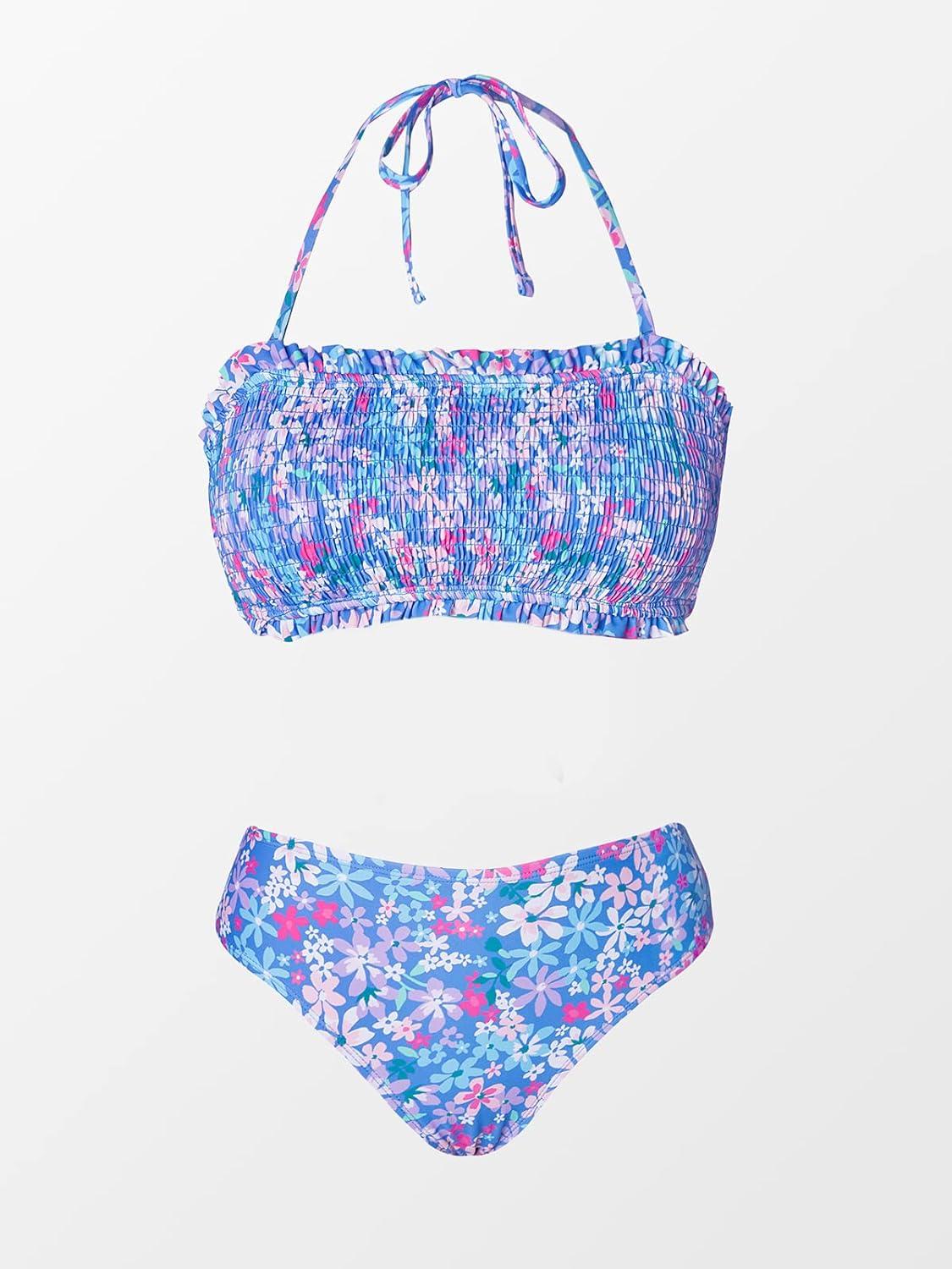 CUPSHE Bikini Set for Women Two Piece Swimsuit Bandeau Top Back Tie Mid Waisted Bottom with Removable Shoulder Straps(Purple Blue Floral)