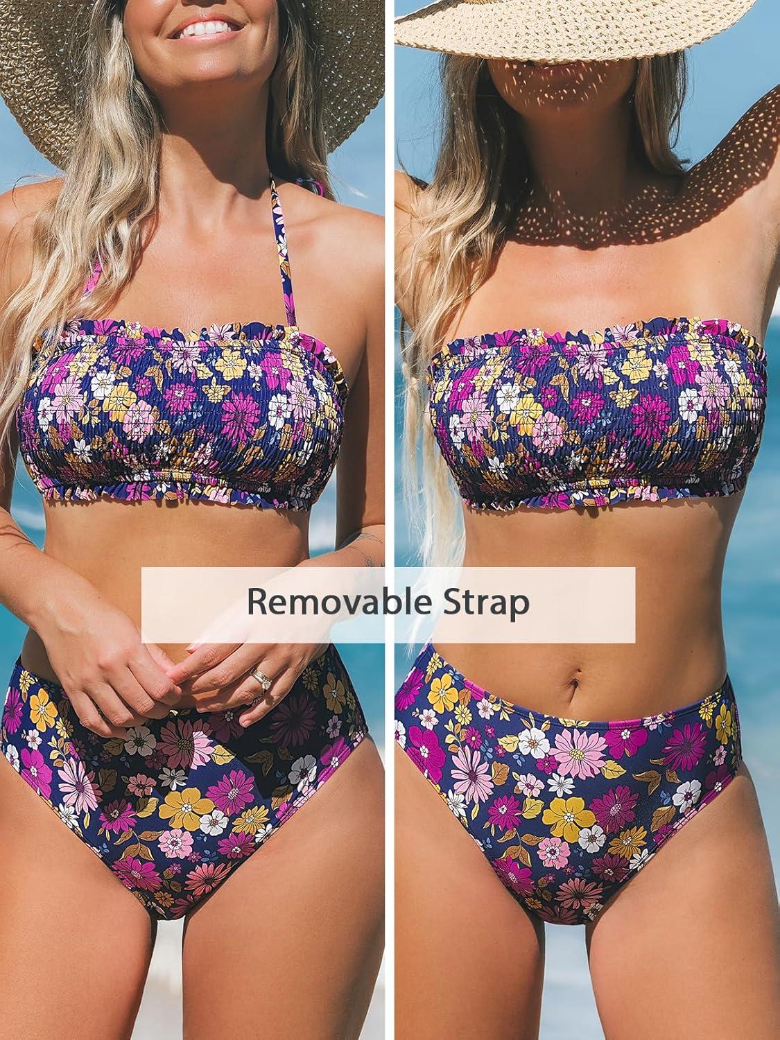 CUPSHE Bikini Set for Women Two Piece Swimsuit Bandeau Top Back Tie Mid Waisted Bottom with Removable Shoulder Straps(Purple/Floral)