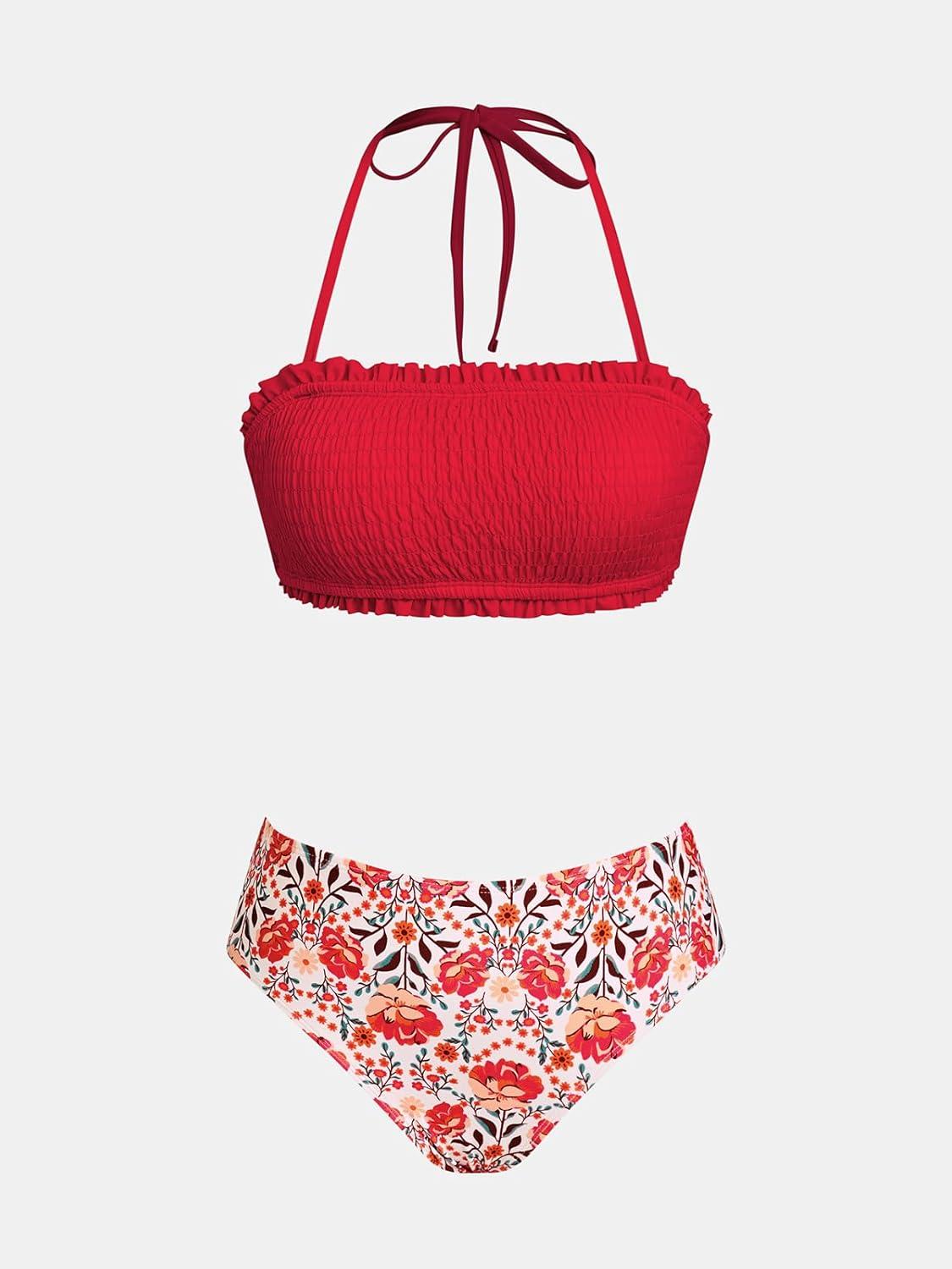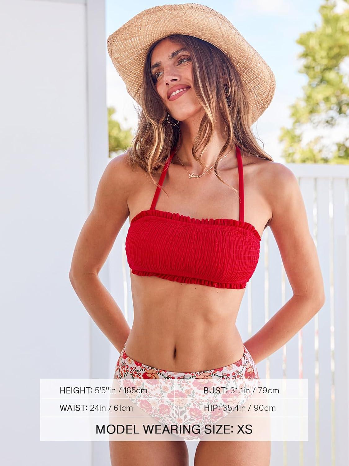 CUPSHE Bikini Set for Women Two Piece Swimsuit Bandeau Top Back Tie Mid Waisted Bottom with Removable Shoulder Straps(Red Floral)