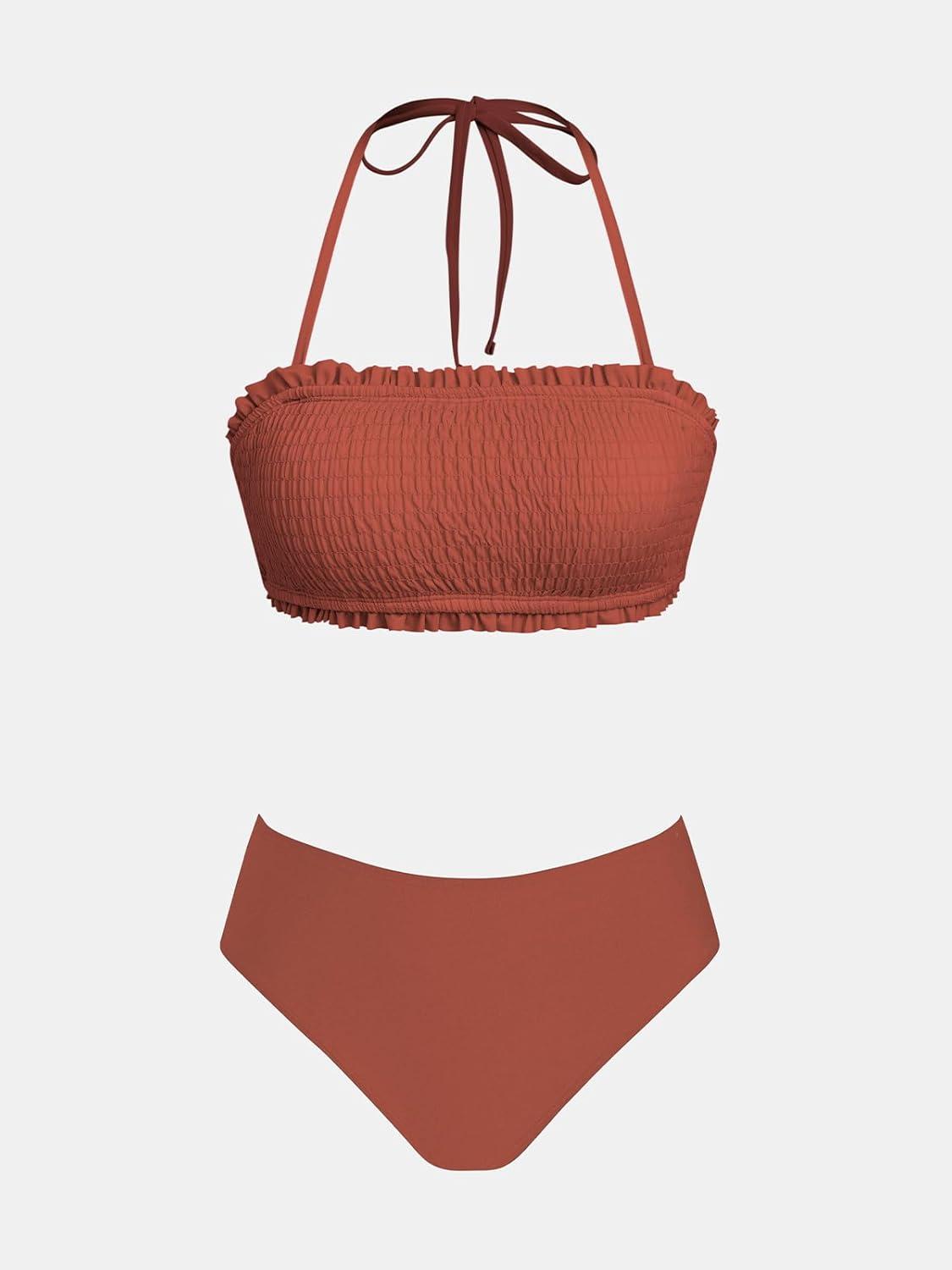 CUPSHE Bikini Set for Women Two Piece Swimsuit Bandeau Top Back Tie Mid Waisted Bottom with Removable Shoulder Straps(Reddish Brown)