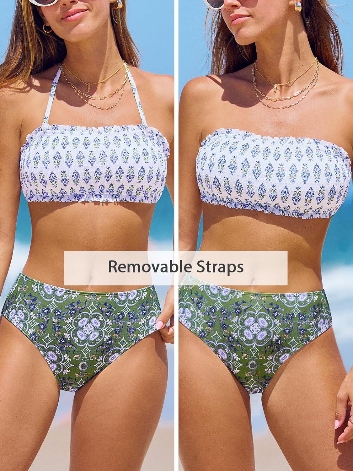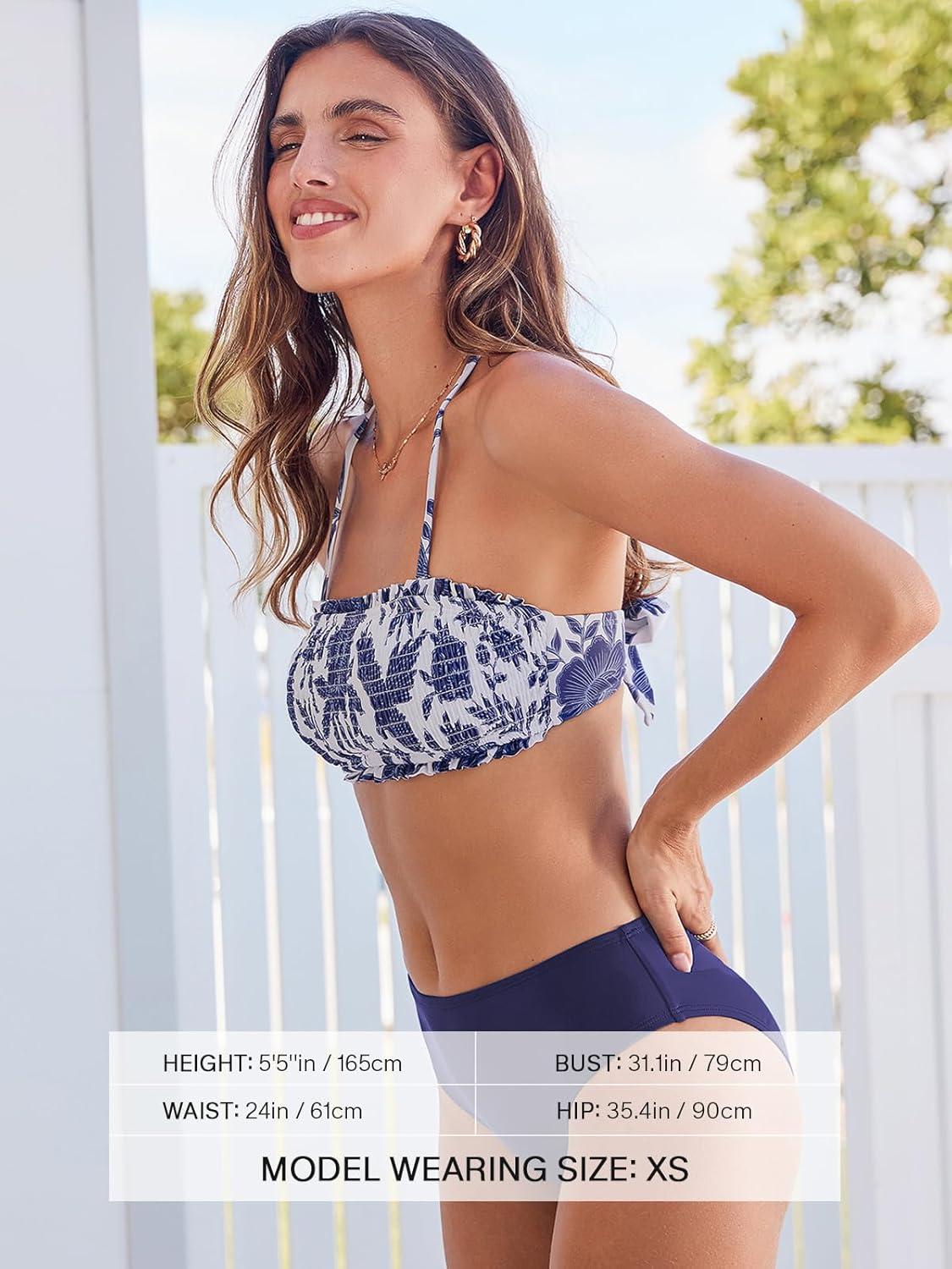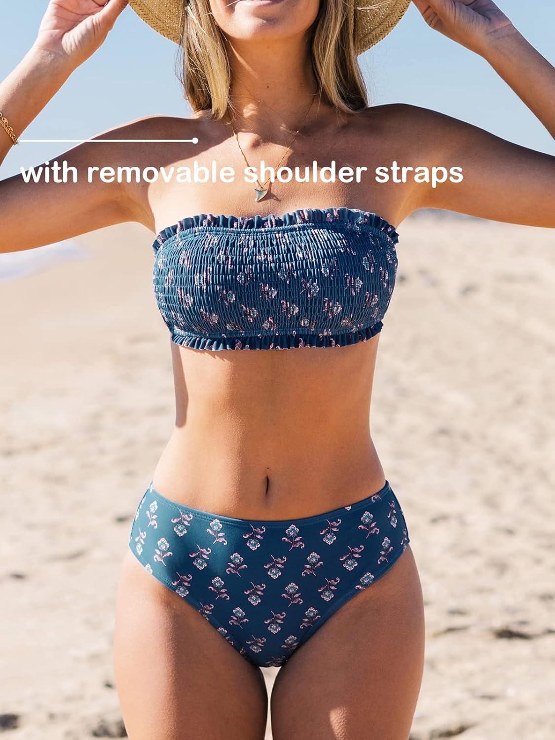 CUPSHE Bikini Set for Women Two Piece Swimsuit Bandeau Top Back Tie Mid Waisted Bottom with Removable Shoulder Straps(Multicolor)
