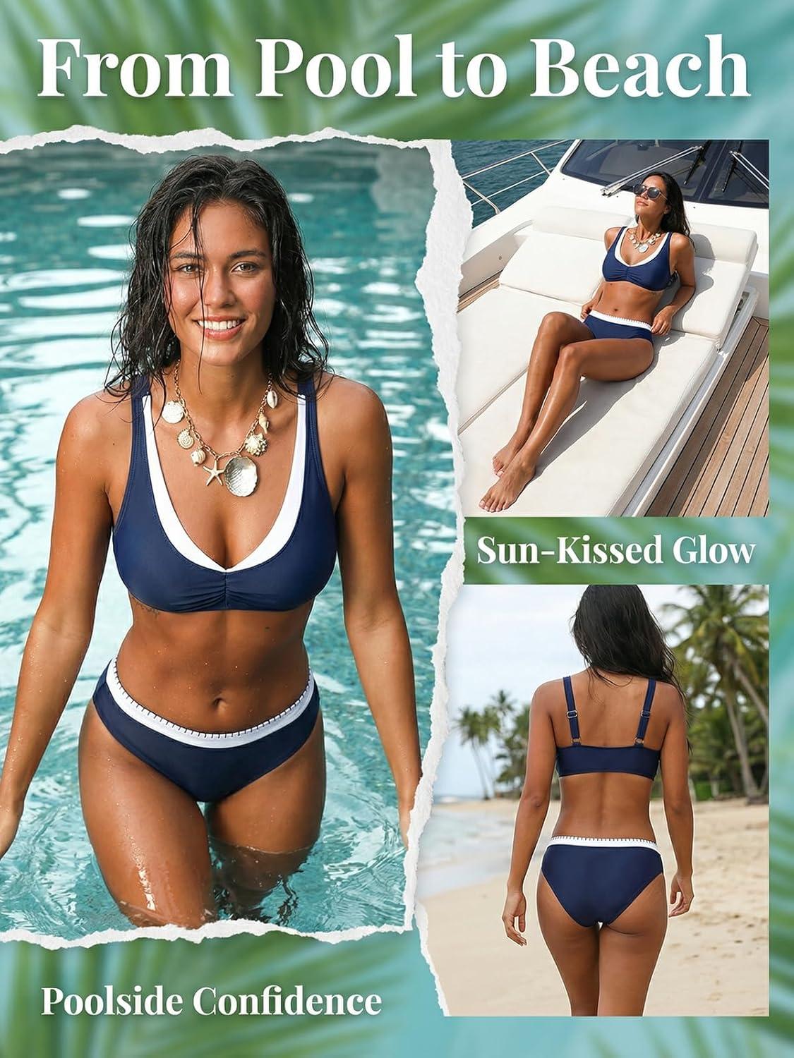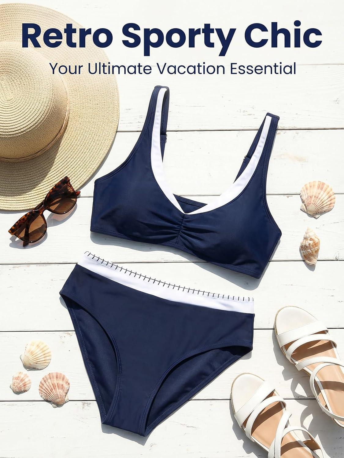 CUPSHE Bikini Sets for Women Two Piece Swimsuit Color Block Sporty Bathing Suit Mid Rise Adjustable Straps(Navy Blue/White)