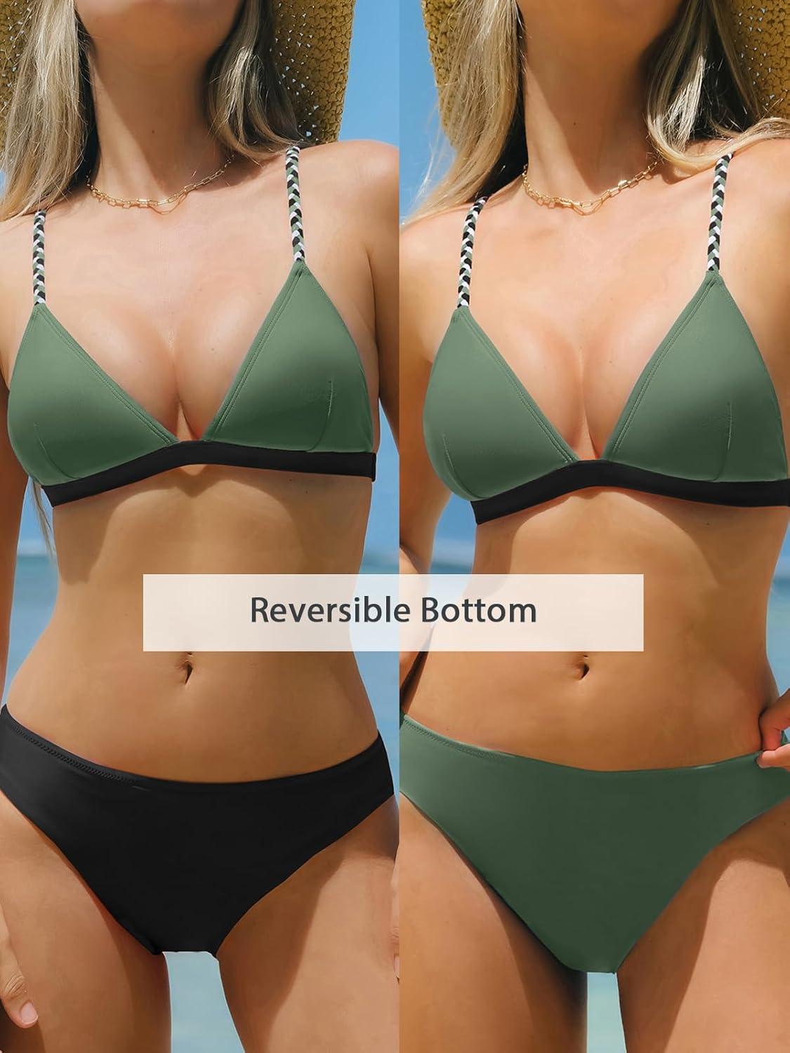 CUPSHE Women’s Bikini Set Cute Two Piece Swimsuits V Neck Color Block Bathing Suit Reversible Bottom Braided Straps(Dark Green/Black)