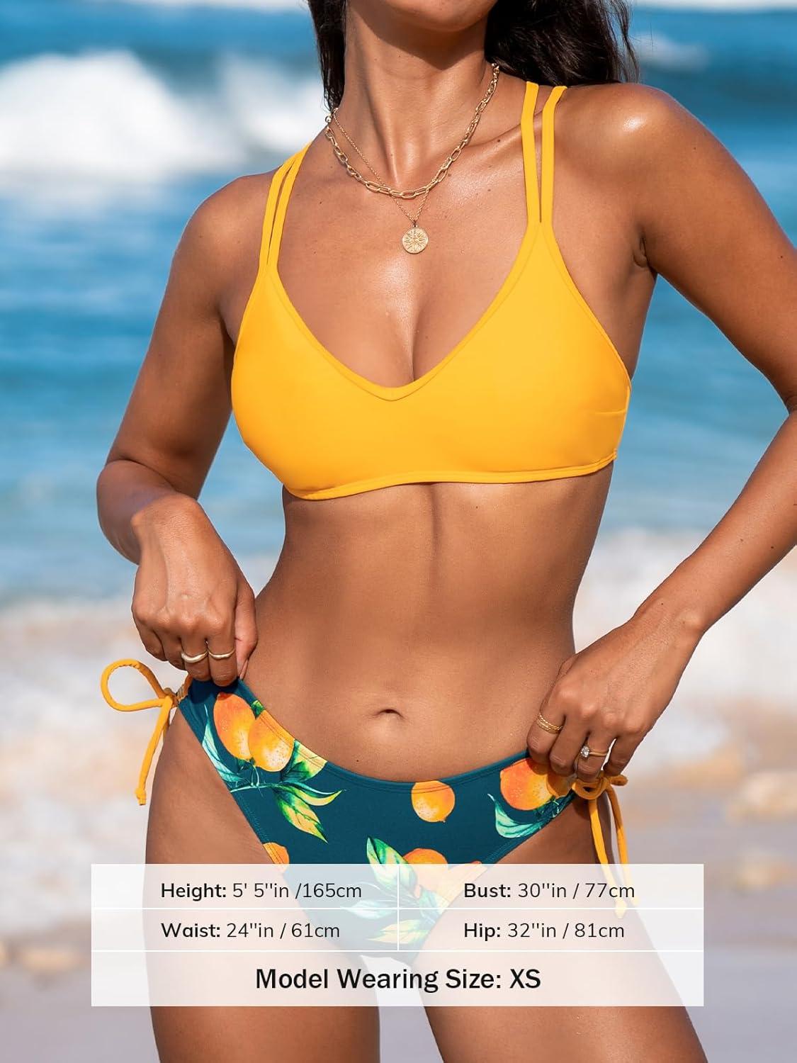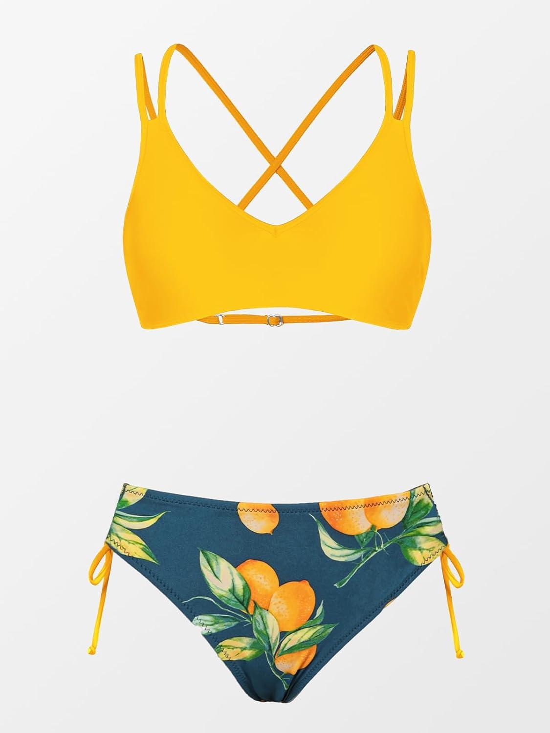 CUPSHE Women Swimsuit Bikini Set Two Piece Bathing Suit Criss Cross Back Strappy Side with Double Spaghetti Straps(Lemon Yellow/Lemon)