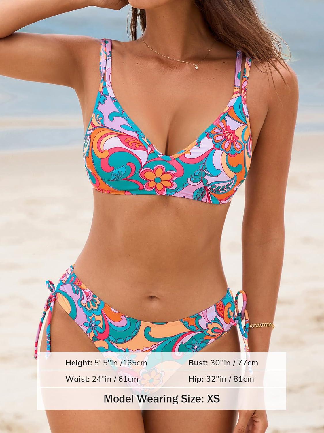 CUPSHE Women Swimsuit Bikini Set Two Piece Bathing Suit Criss Cross Back Strappy Side with Double Spaghetti Straps(Multi Color/Paisley)