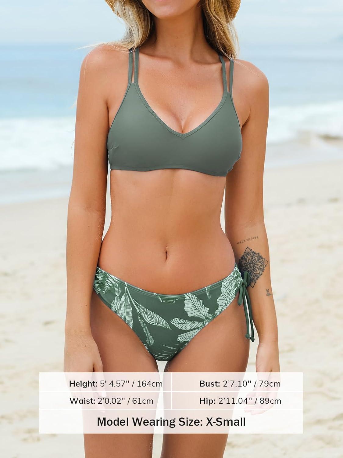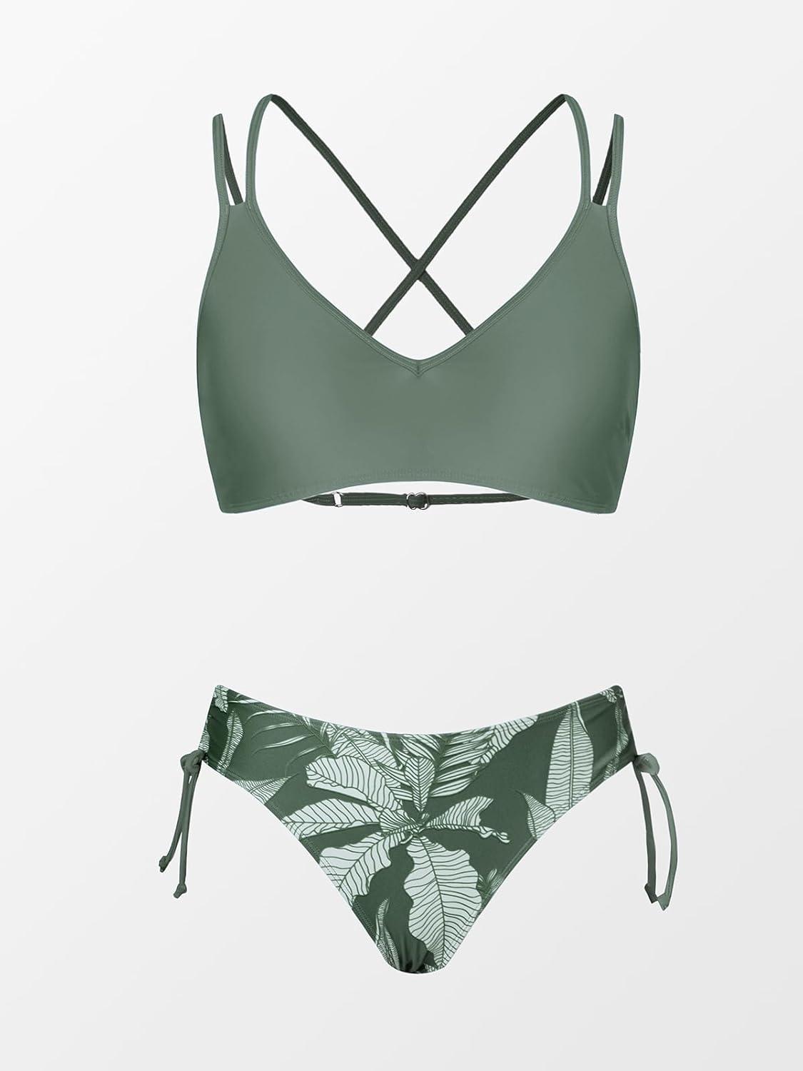 CUPSHE Women Swimsuit Bikini Set Two Piece Bathing Suit Criss Cross Back Strappy Side with Double Spaghetti Straps(Sage Green / Tropical)