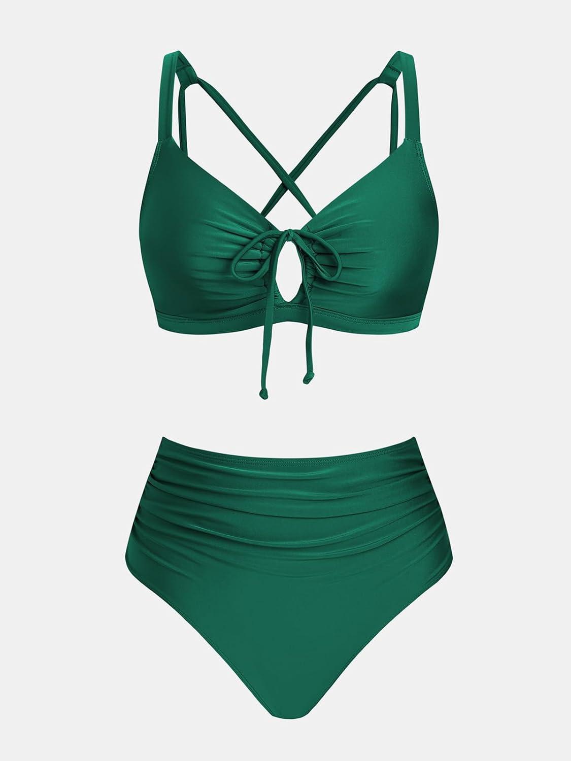 CUPSHE Women’s Bikini Set High Waisted Two Piece Swimsuit Front Cutout Bathing Suit Lace Up Back Self Tie Ruched(Dark Green)