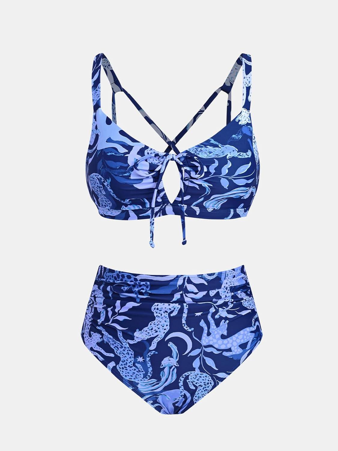 CUPSHE Women’s Bikini Set High Waisted Two Piece Swimsuit Front Cutout Bathing Suit Lace Up Back Self Tie Ruched(Navy Blue/Animal)
