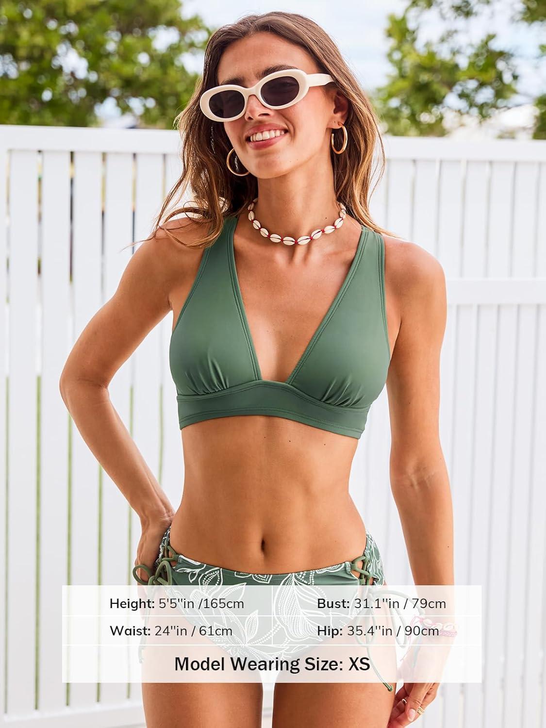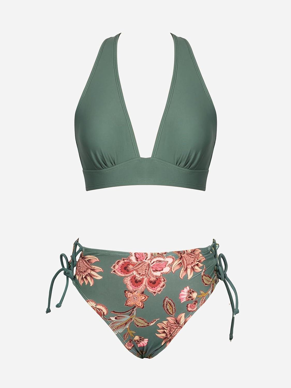 CUPSHE Bikini Set for Women Two Piece Swimsuit V Neck Triangle Top Wide Straps Cross Back Lace up Mid Rise(Olive Green/Floral)