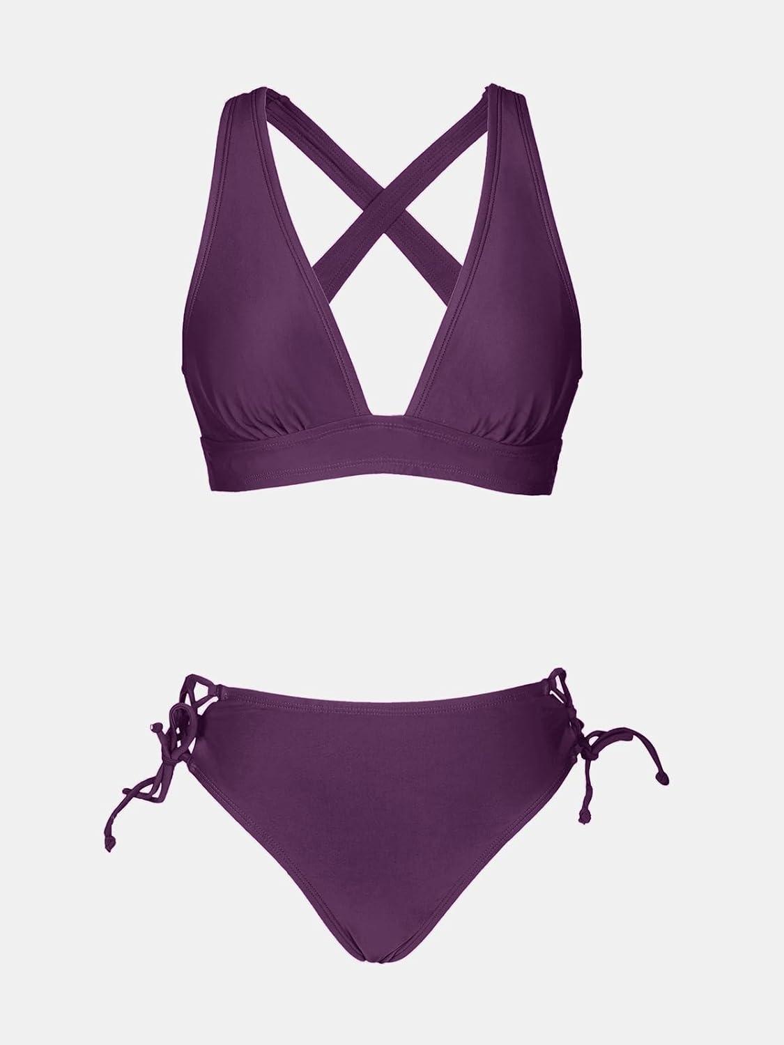 CUPSHE Bikini Set for Women Two Piece Swimsuit V Neck Triangle Top Wide Straps Cross Back Lace up Mid Rise(Grape Purple)