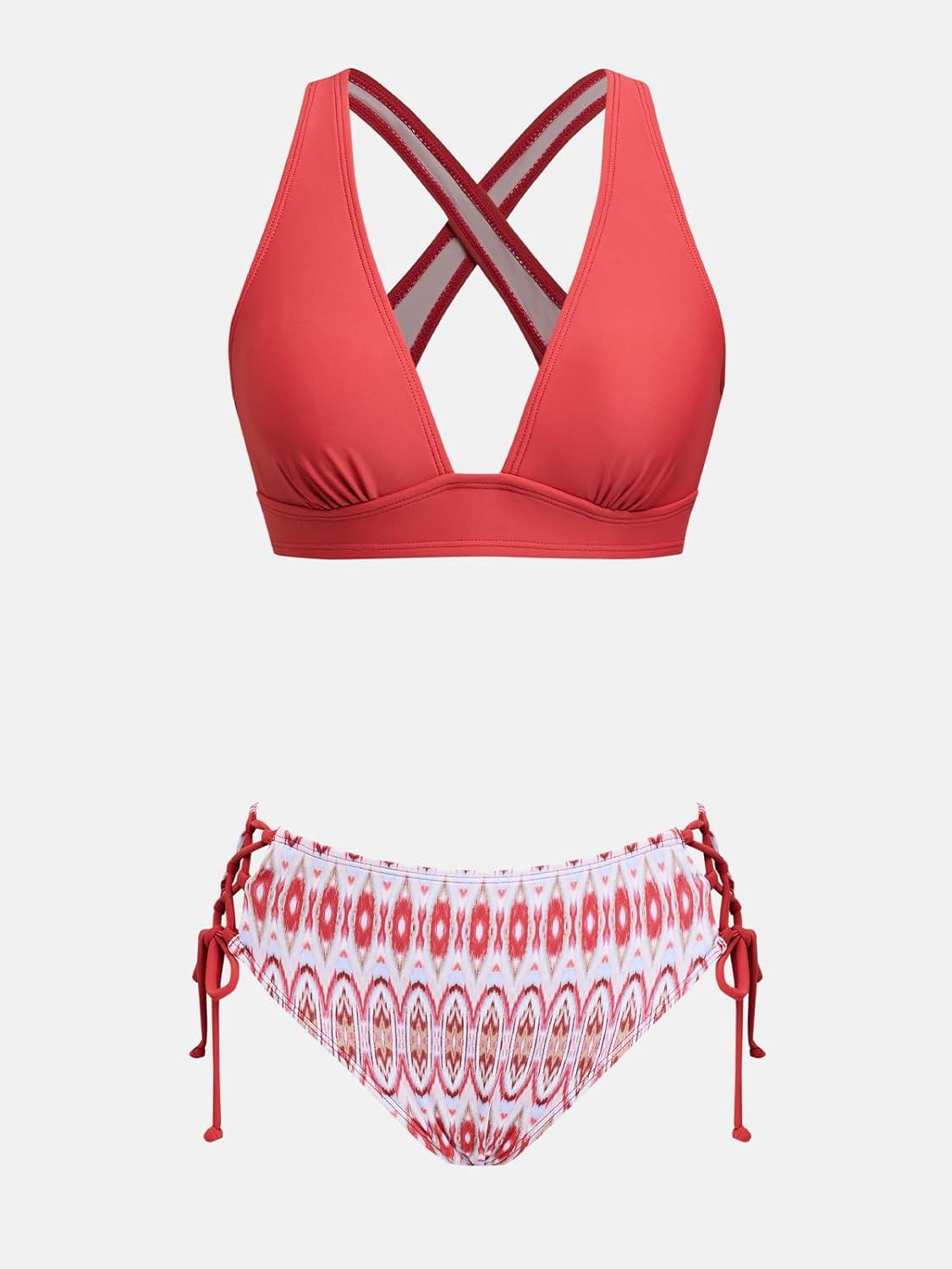 CUPSHE Bikini Set for Women Two Piece Swimsuit V Neck Triangle Top Wide Straps Cross Back Lace up Mid Rise(Magenta Red/Tribal)