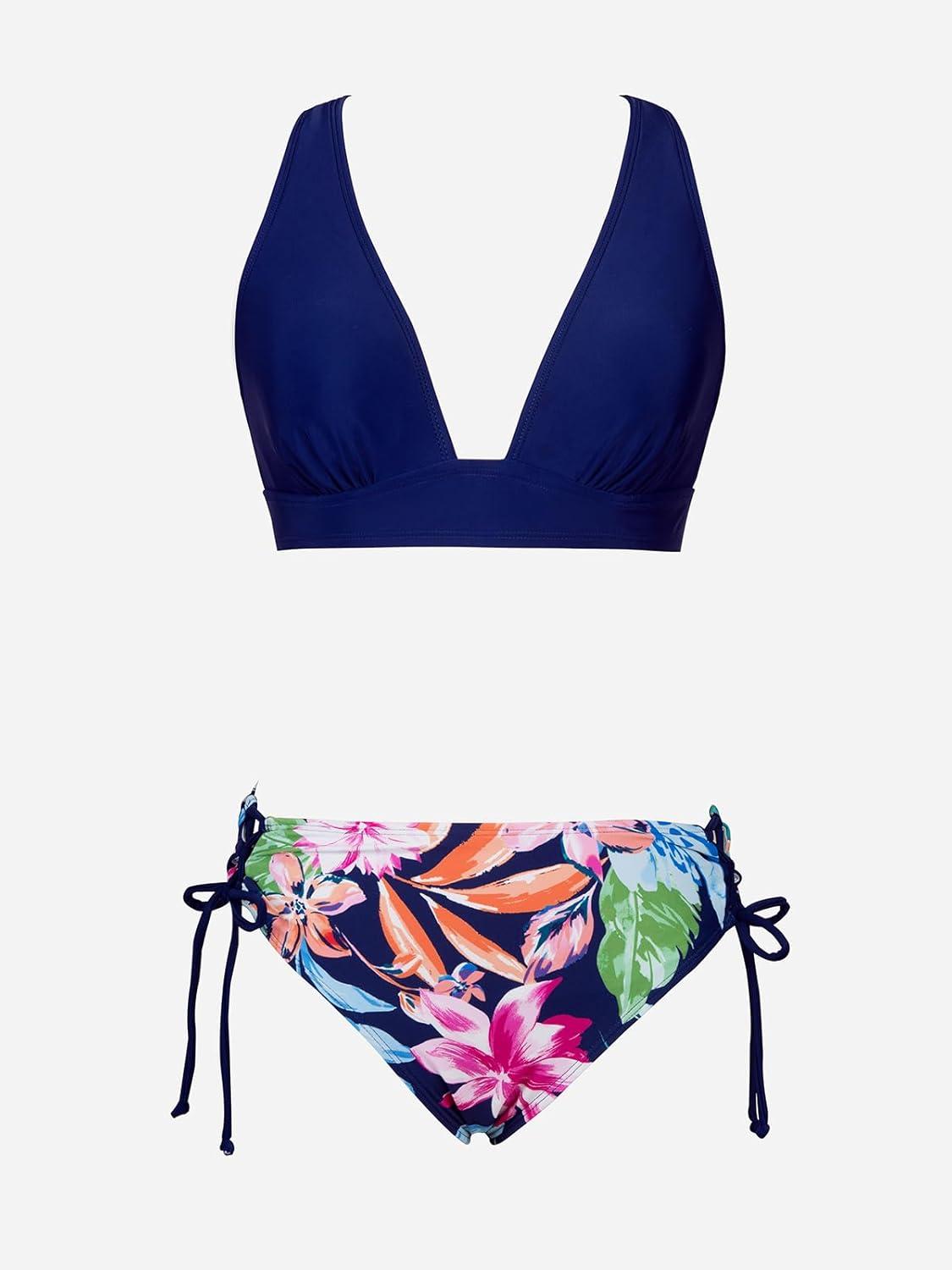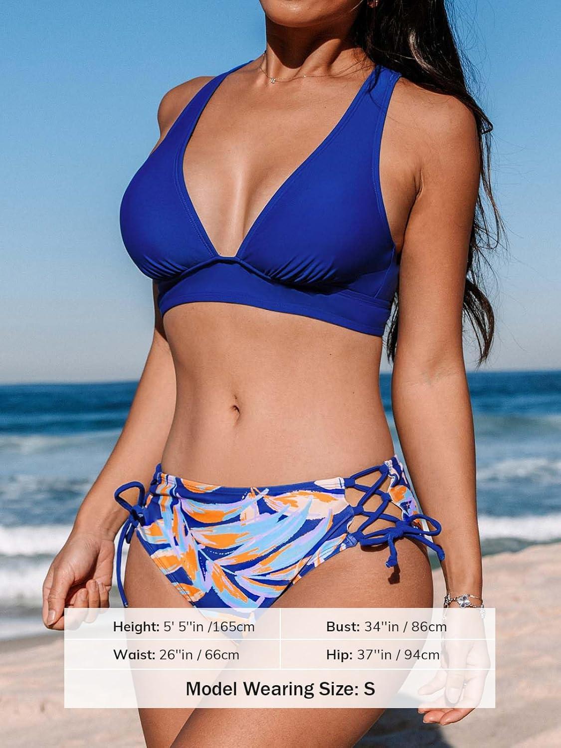 CUPSHE Bikini Set for Women Two Piece Swimsuit V Neck Triangle Top Wide Straps Cross Back Lace up Mid Rise(Navy Blue/Tropical)