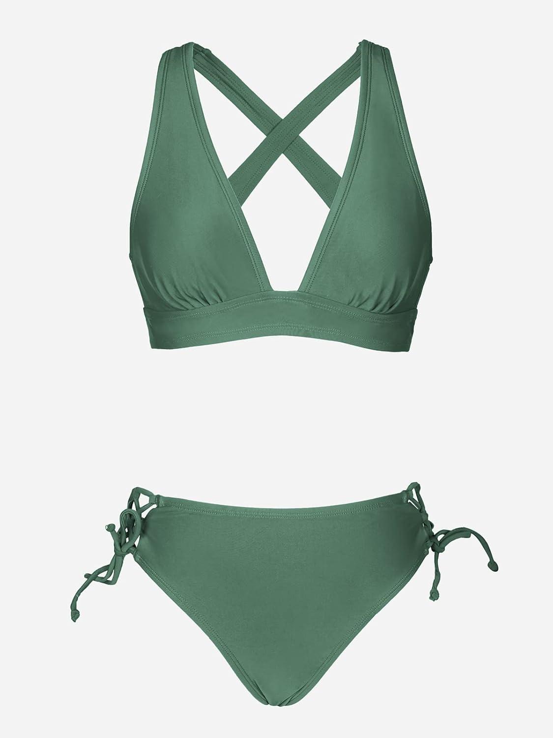 CUPSHE Bikini Set for Women Two Piece Swimsuit V Neck Triangle Top Wide Straps Cross Back Lace up Mid Rise(Olive Green)