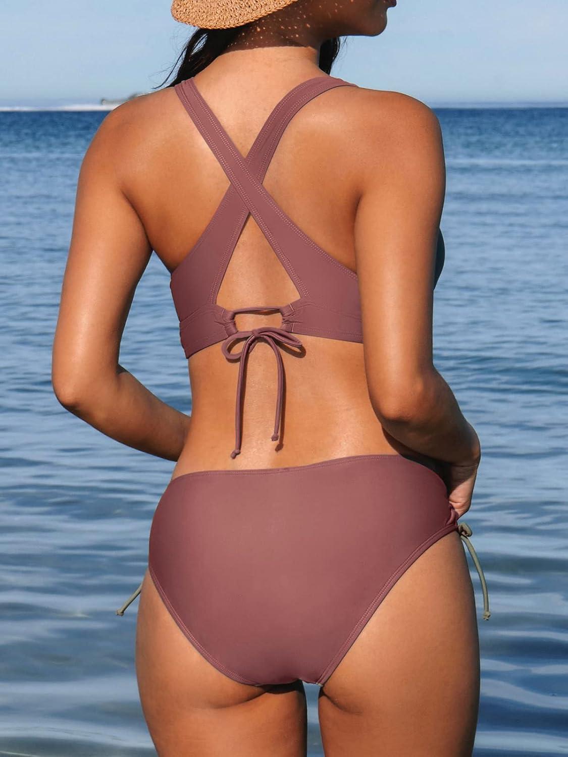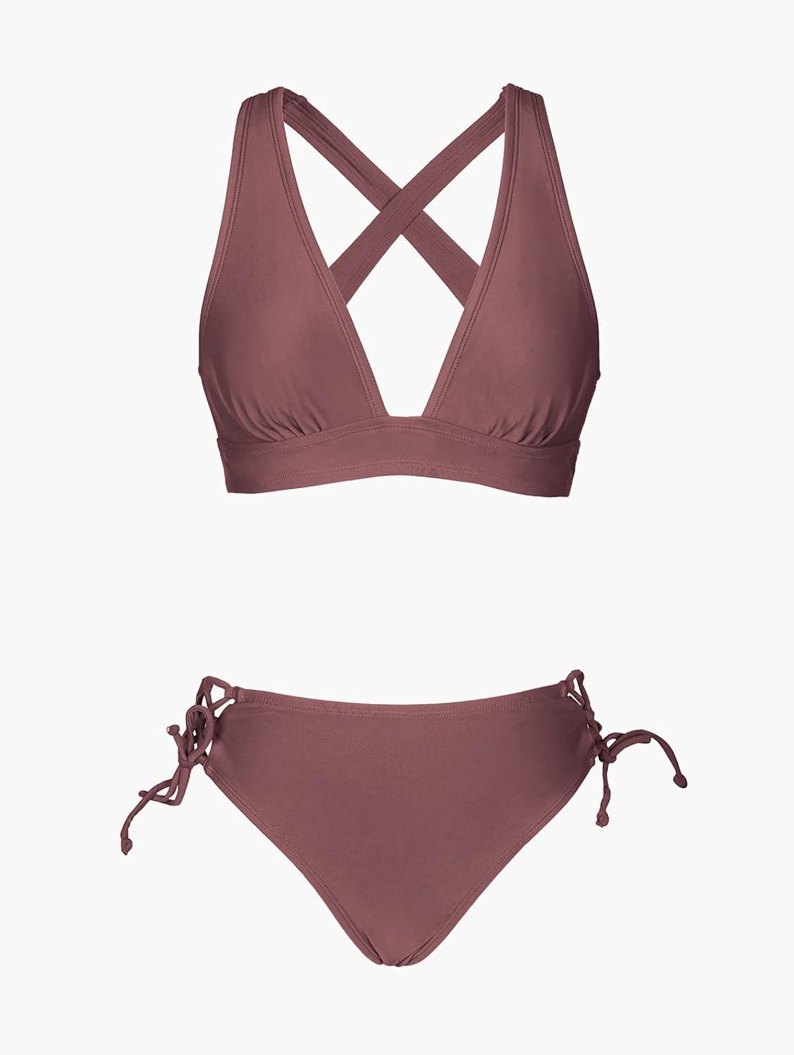 CUPSHE Bikini Set for Women Two Piece Swimsuit V Neck Triangle Top Wide Straps Cross Back Lace up Mid Rise(Pale Mauve)
