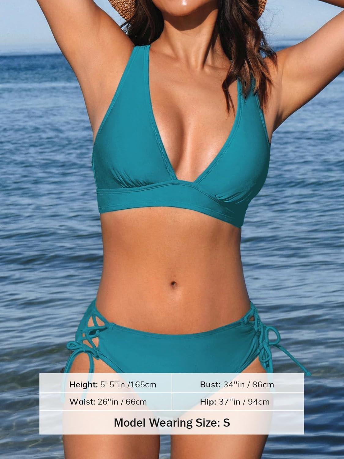 CUPSHE Bikini Set for Women Two Piece Swimsuit V Neck Triangle Top Wide Straps Cross Back Lace up Mid Rise(Teal Blue)