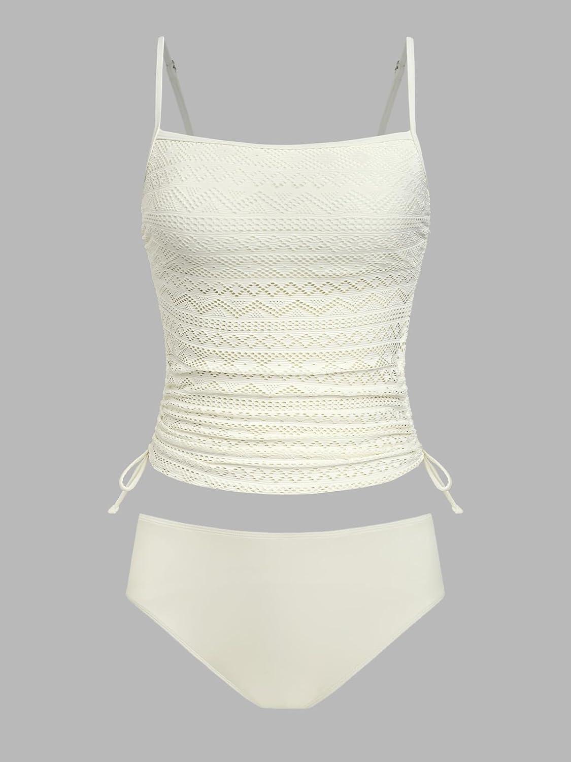 CUPSHE Women’s Tankini Sets Two Piece Swimsuit Square Neck Mesh Bathing Suit Adjustable Spaghetti Straps Drawstring(Beige)