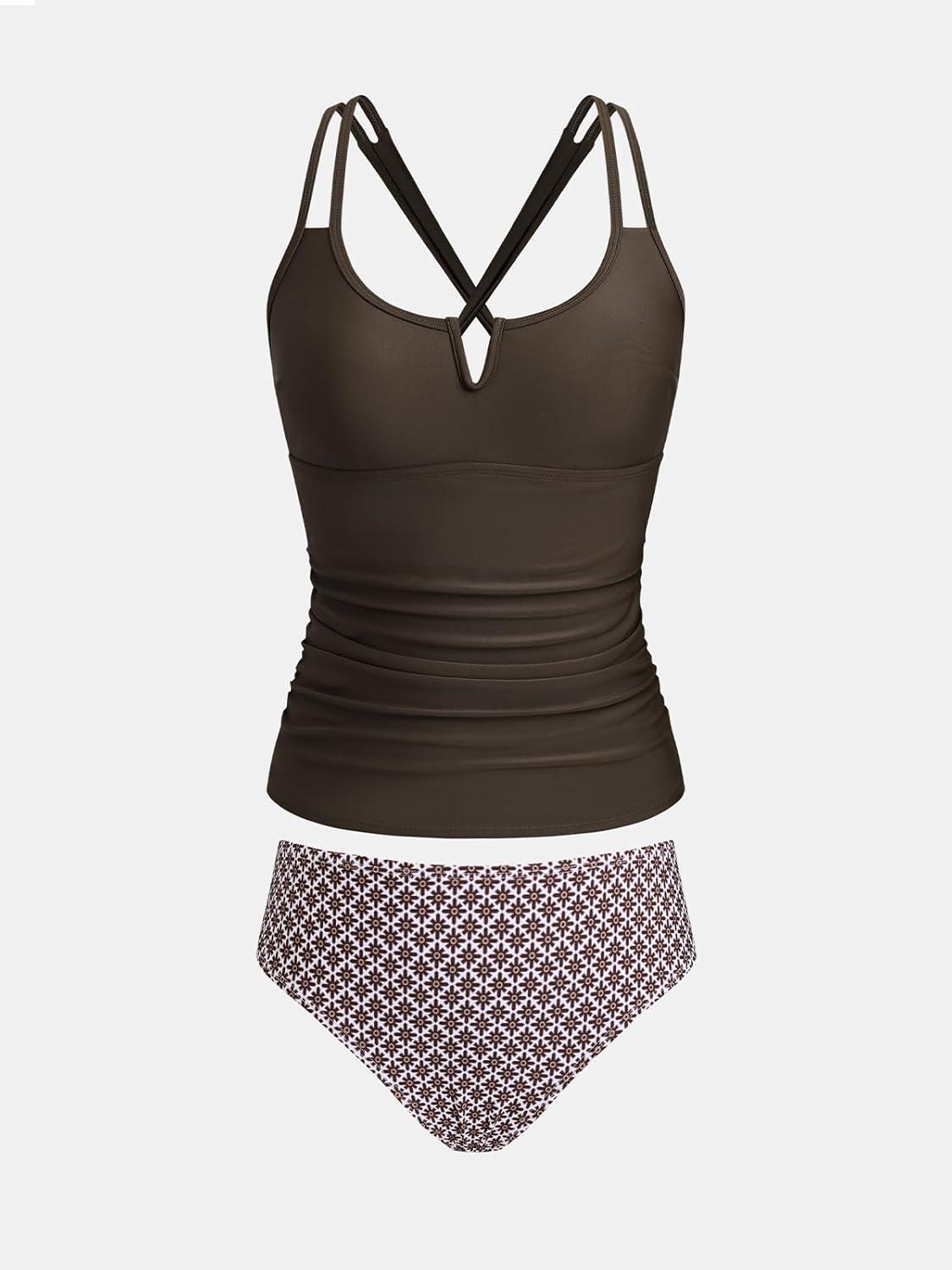 CUPSHE Women’s Tankini Sets Two Piece Swimsuit Scoop Neck V Cut Double Straps Self Tied Bathing Suit Ruched Tummy(Chocolate Brown/White Floal)