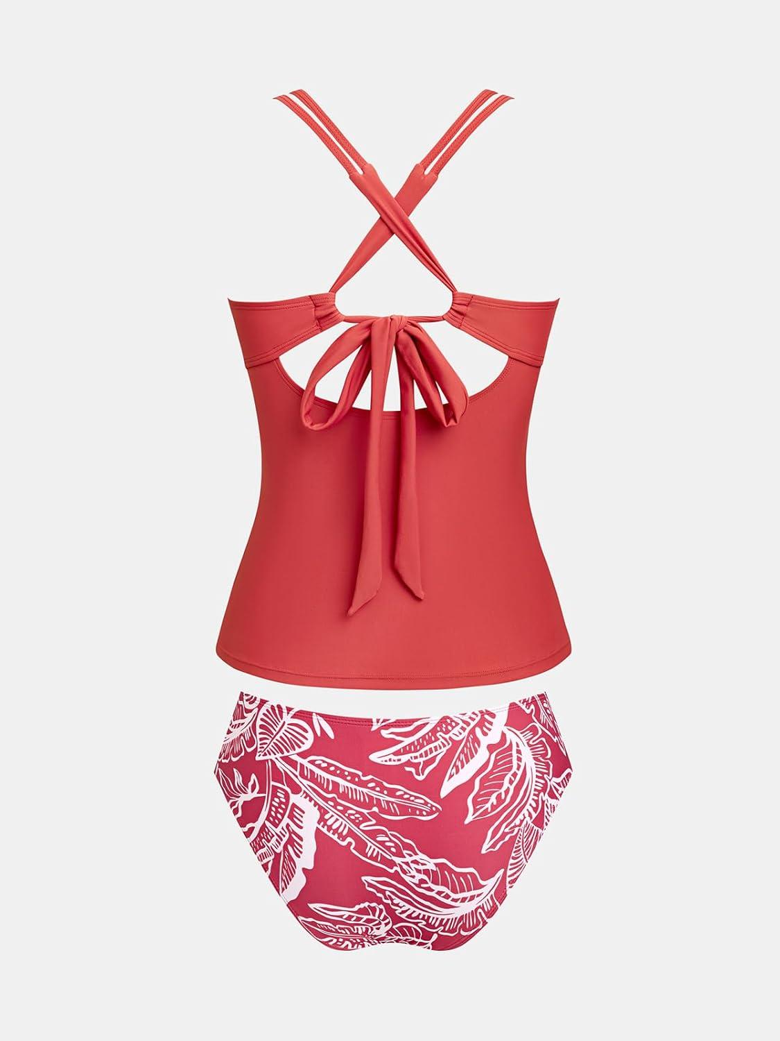 CUPSHE Women’s Tankini Sets Two Piece Swimsuit Scoop Neck Ruched Adjustable Straps Drawstring Mid Rise(Brick Red/Leaf)