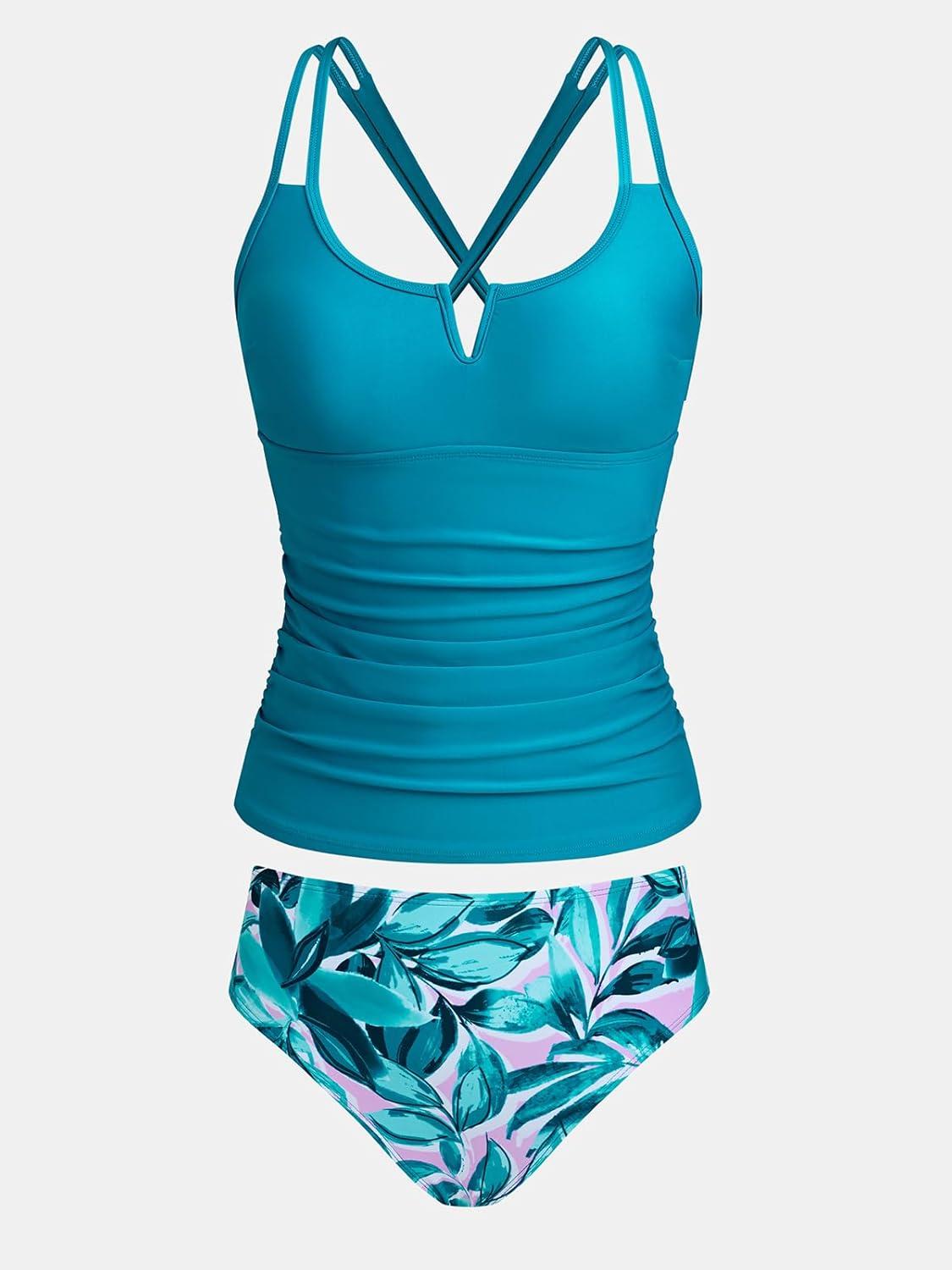 CUPSHE Women’s Tankini Sets Two Piece Swimsuit Scoop Neck V Cut Double Straps Self Tied Bathing Suit Ruched Tummy(Teal Blue/Floral)