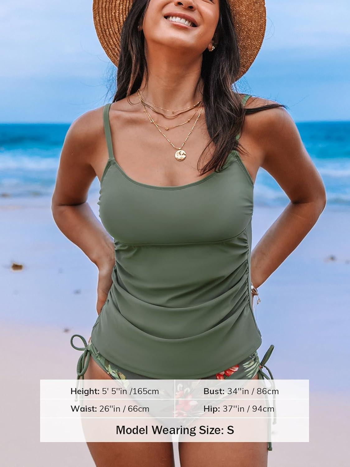CUPSHE Women’s Tankini Sets Two Piece Swimsuit Scoop Neck Ruched Adjustable Straps Drawstring Mid Rise(Smoke Green/Floral)