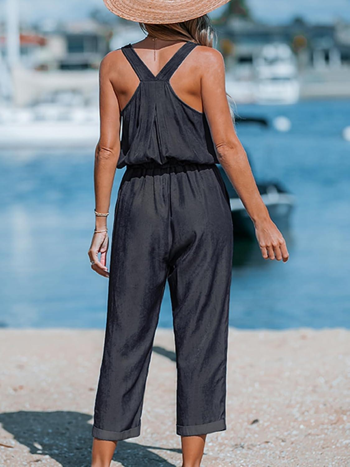 CUPSHE Women’s Casual V Neck Spaghetti Straps Jumpsuit Sleeveless Baggy Long Pants Overall Outfit with Pockets(Dark Grey)