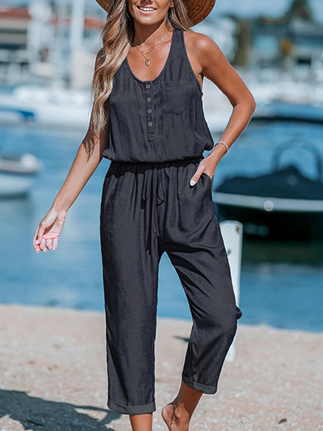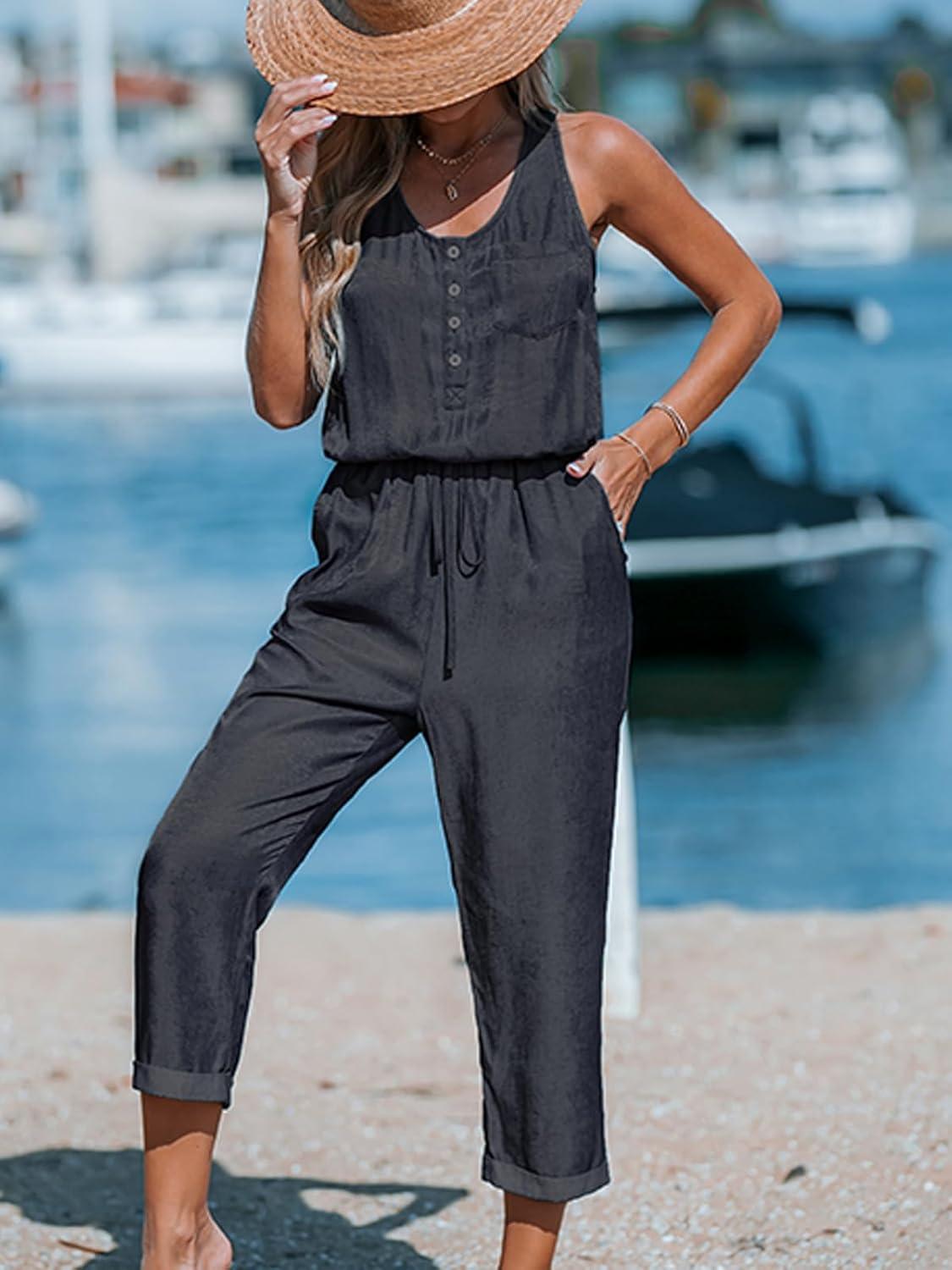 CUPSHE Women’s Casual Sleeveless Scoop Neck Button Down Overalls With Pockets(Black)