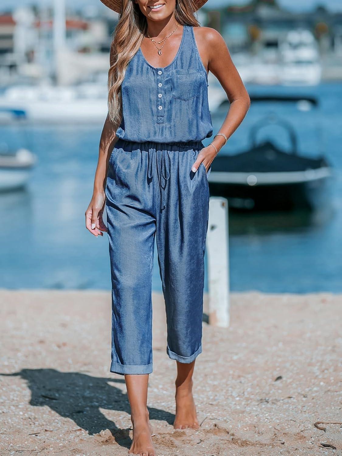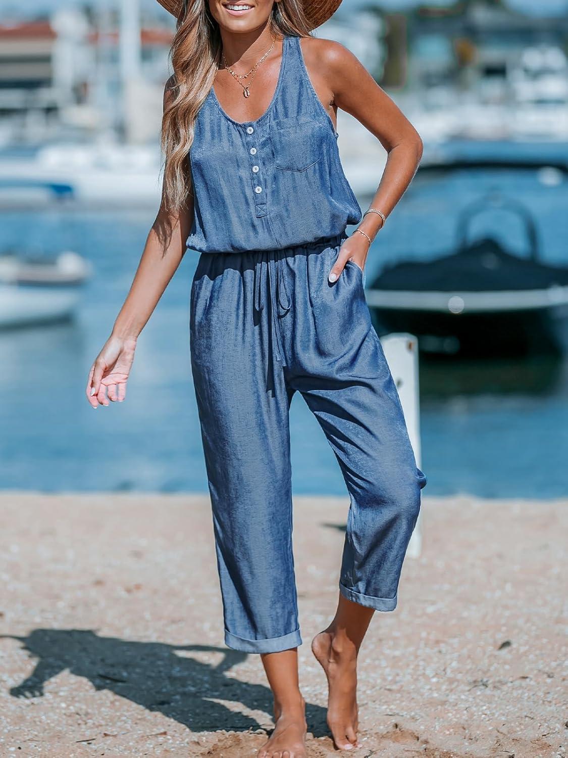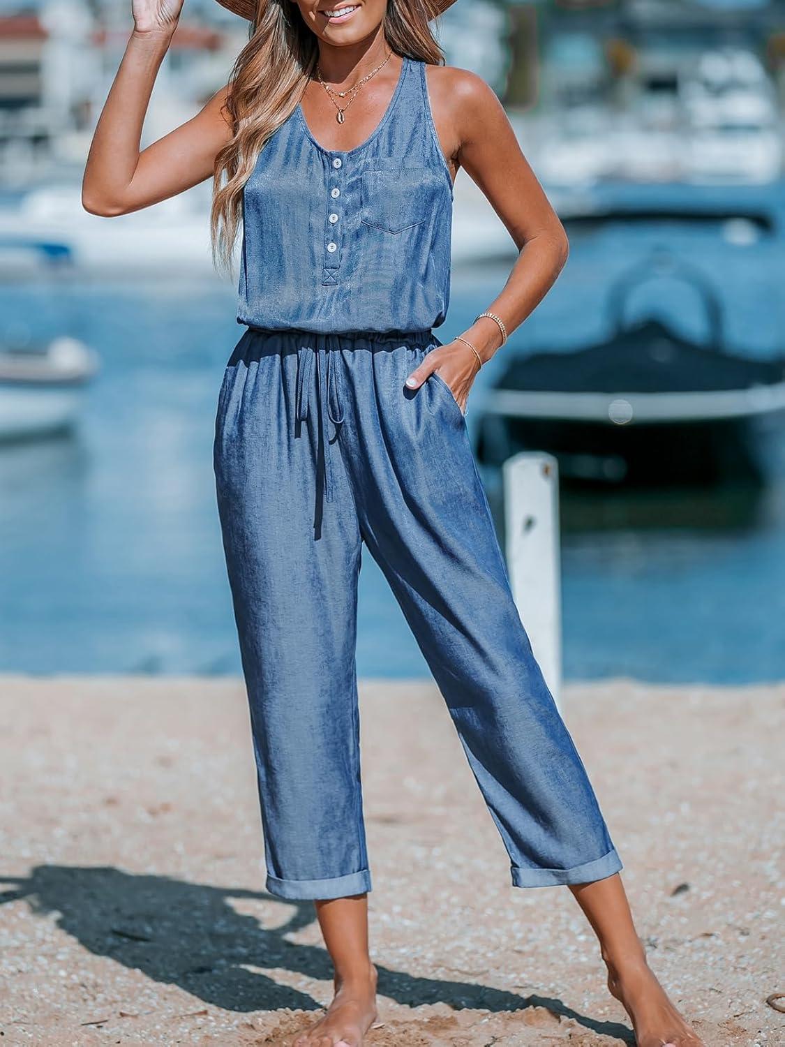 CUPSHE Women’s Casual Sleeveless Scoop Neck Button Down Overalls With Pockets(Blue)
