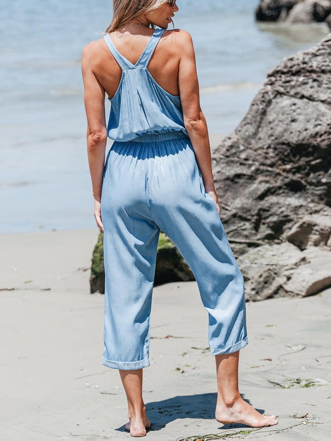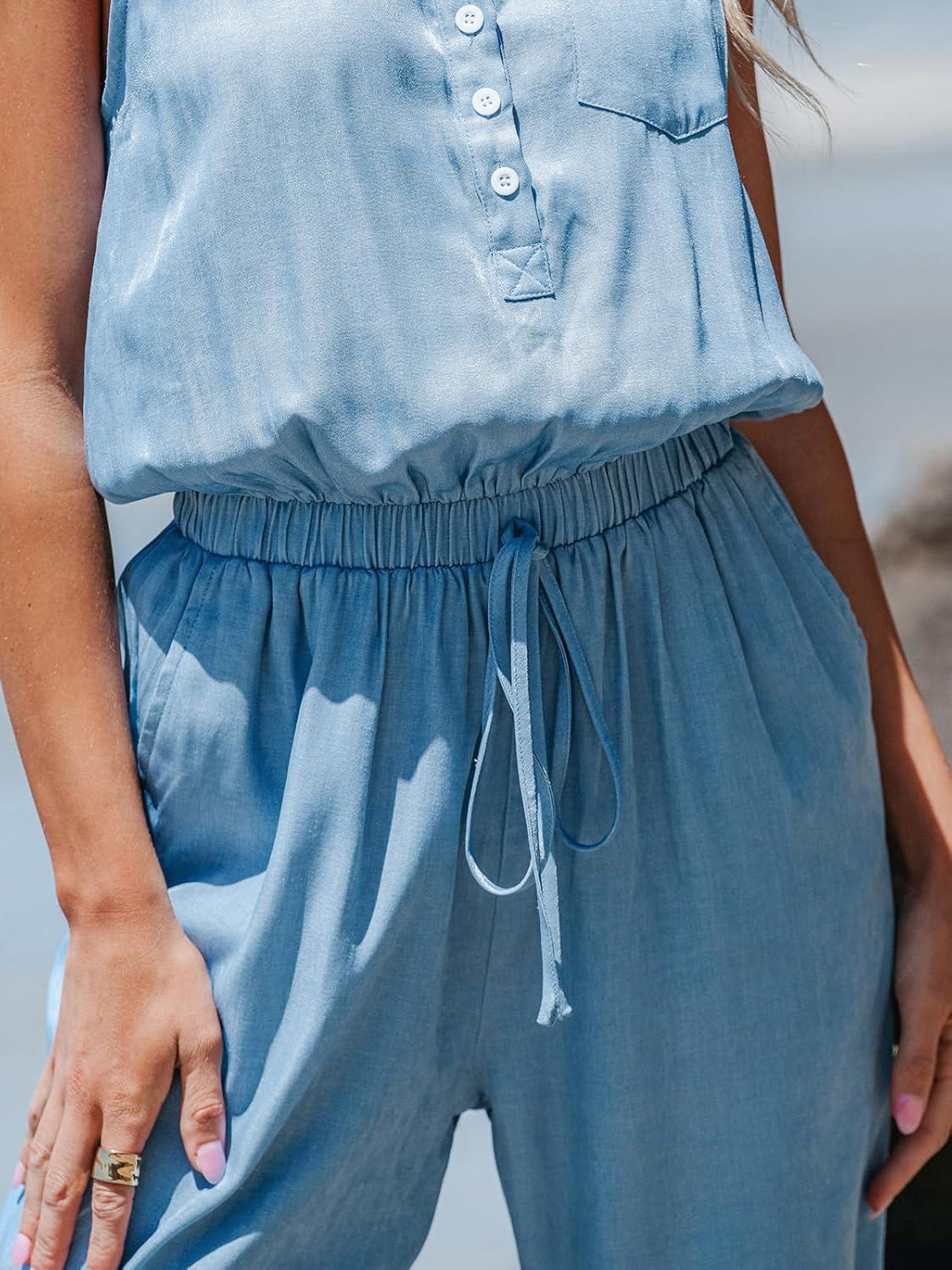 CUPSHE Women’s Casual Sleeveless Scoop Neck Button Down Overalls With Pockets(Light Blue)