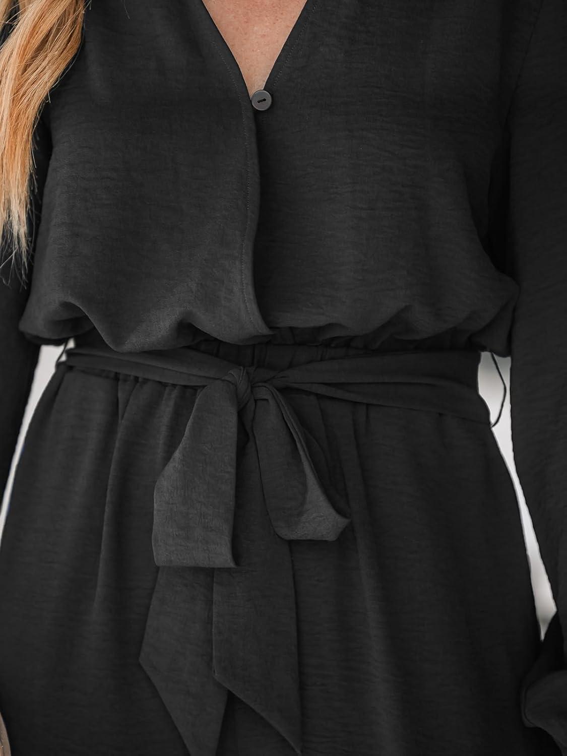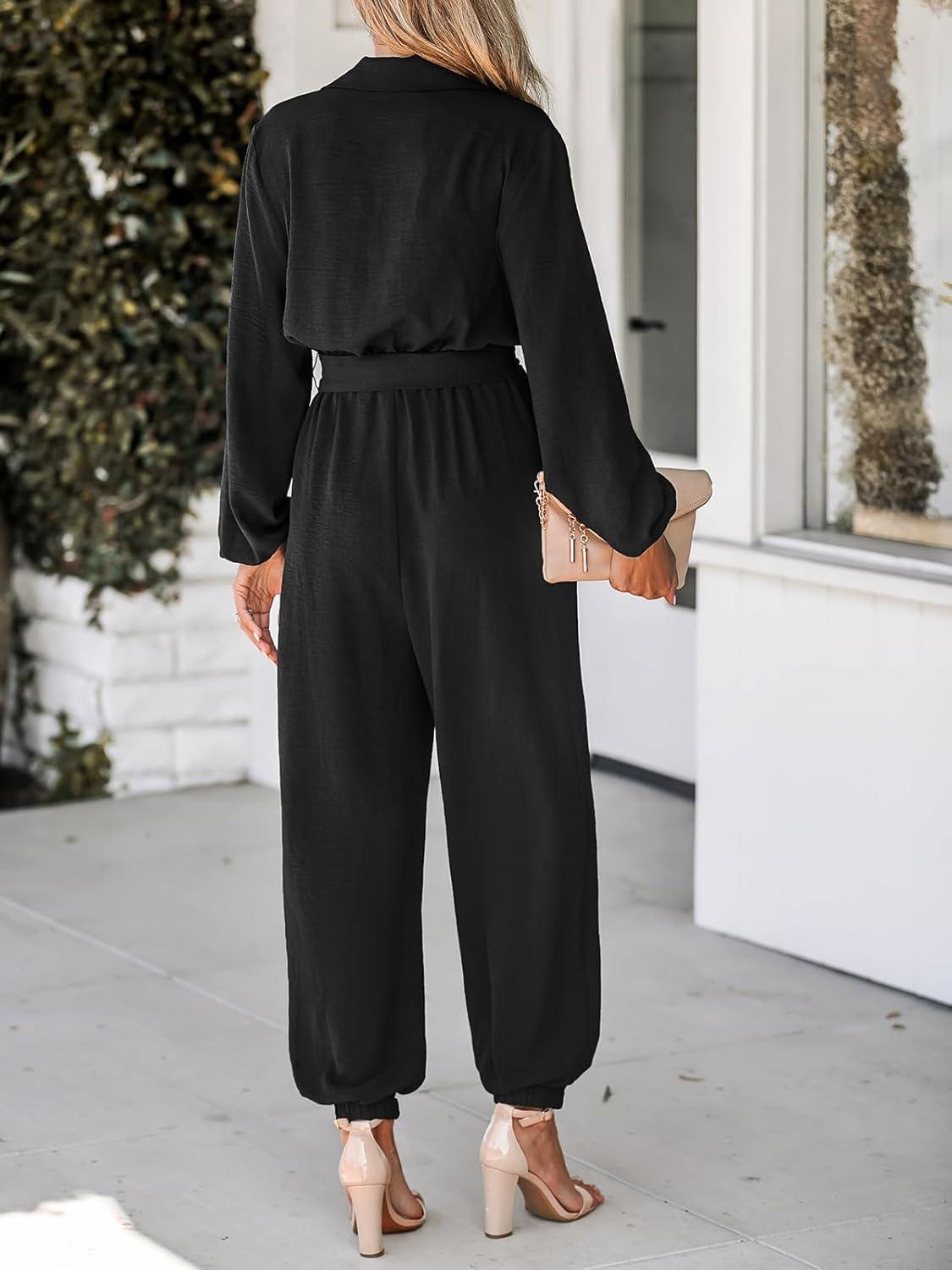 CUPSHE Women’s Jumpsuits Belted Jogger Jumpsuit Long Sleeve Overall V Neck Outfit Casual Dressy(Black)