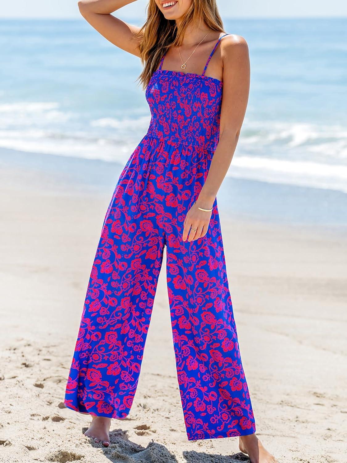CUPSHE Women’s Jumpsuits Floral Square Neck Smocked Bodice Jumpsuit Sleeveless Overall Straight Leg Outfit Casual(Purple)