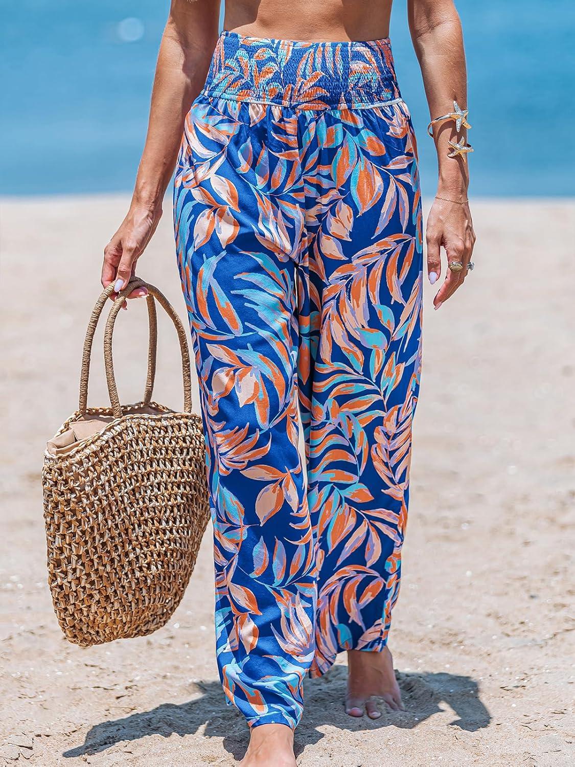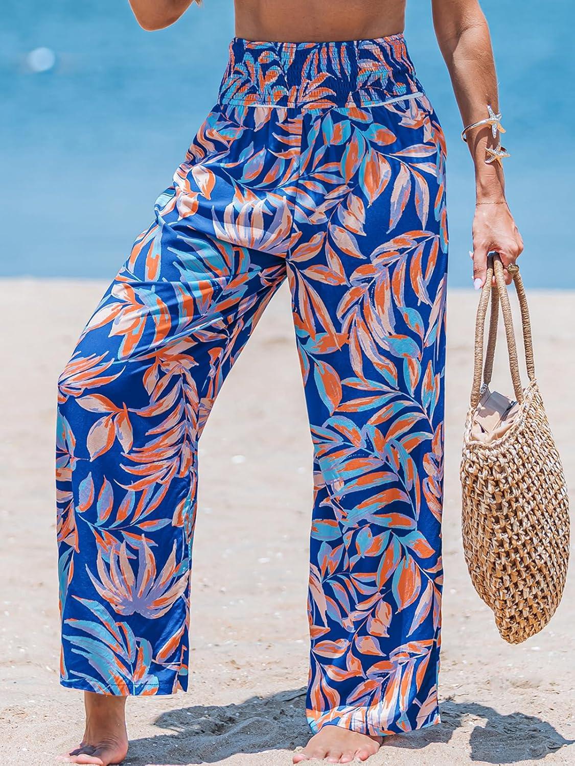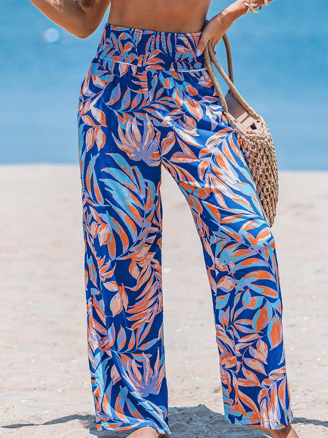 CUPSHE Women Swimsuit Cover Ups Pants High Waist Smokced Wide Leg Beach Vacation Outfits(Tropical Leaf)
