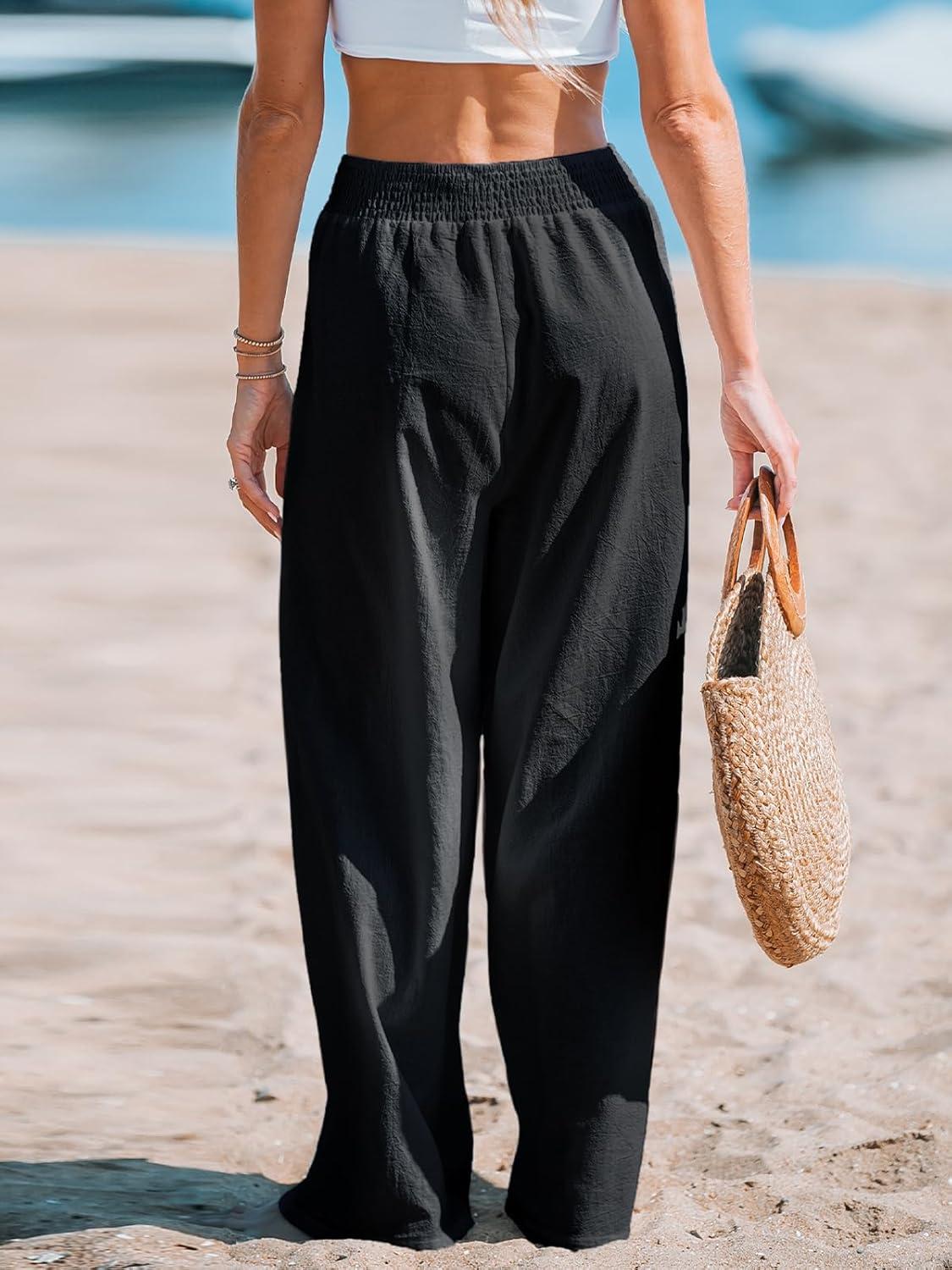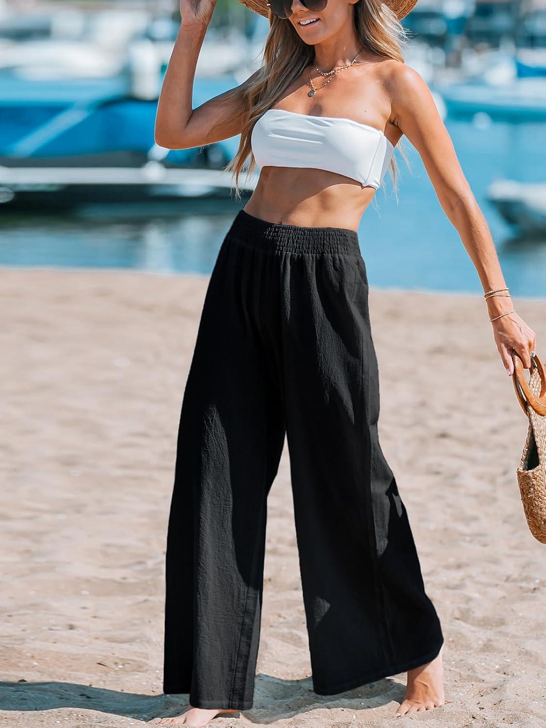 CUPSHE Women’s Beach Pants Flowy Wide Leg Cover Up High Waist Smocked Swimwear Cover Ups(Black)