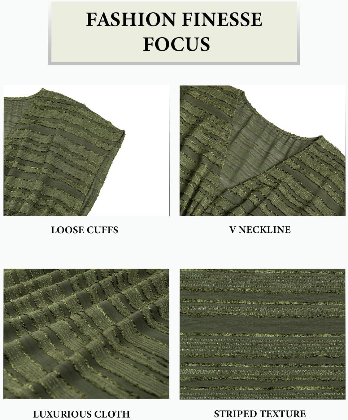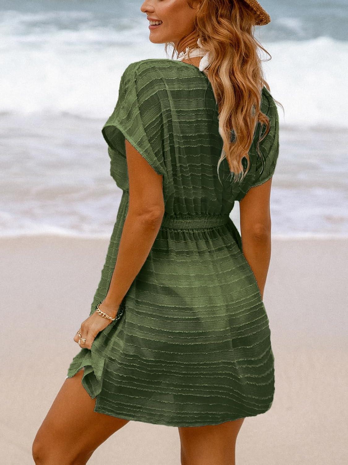 CUPSHE Women’s Swim Cover Up Dress V Neck Textured Striped Short Sleeve Cover Ups Casual Beach Summer(Army Green)