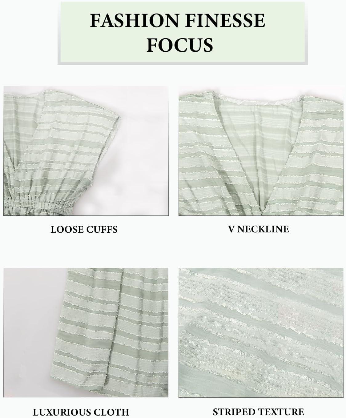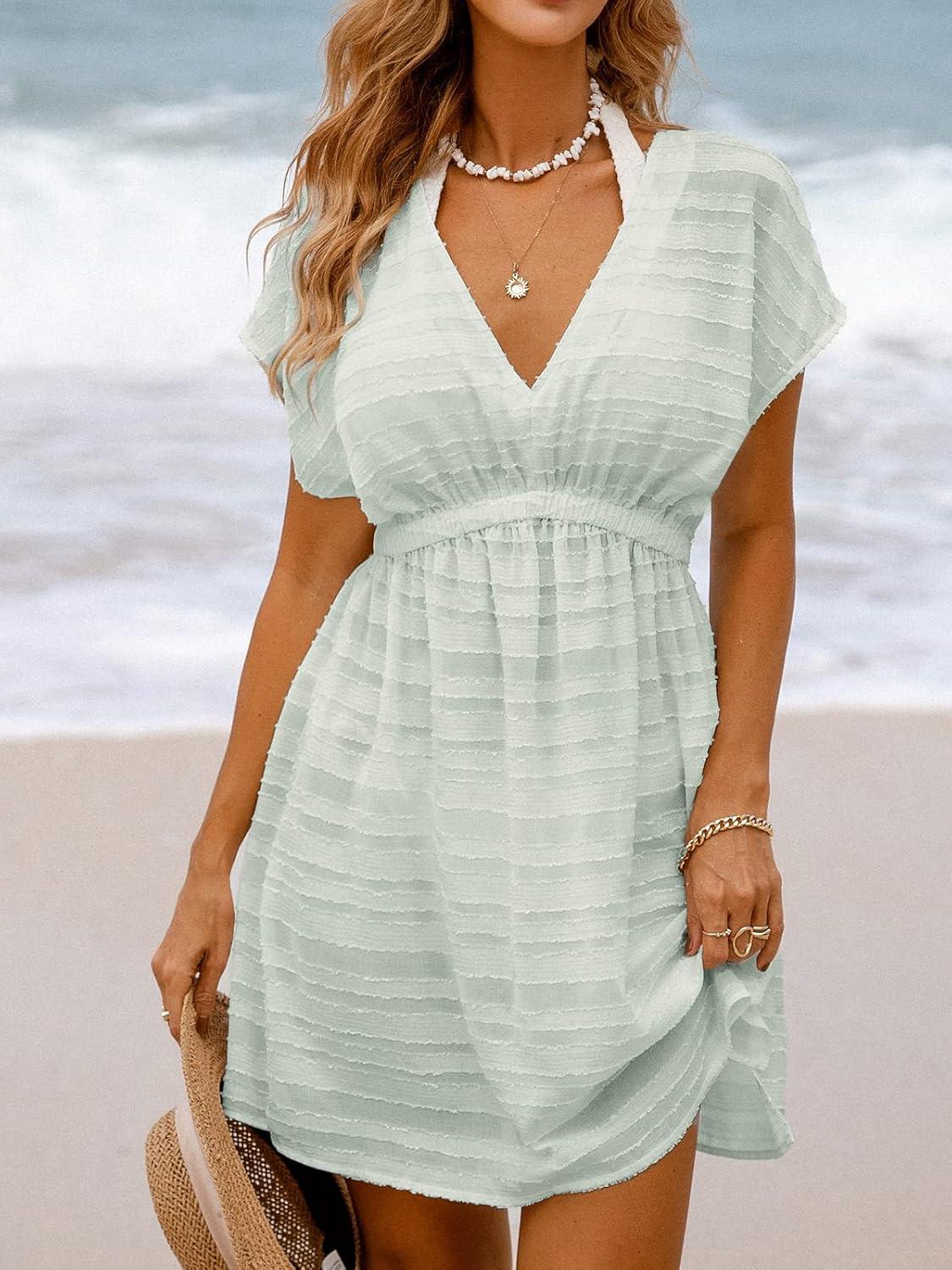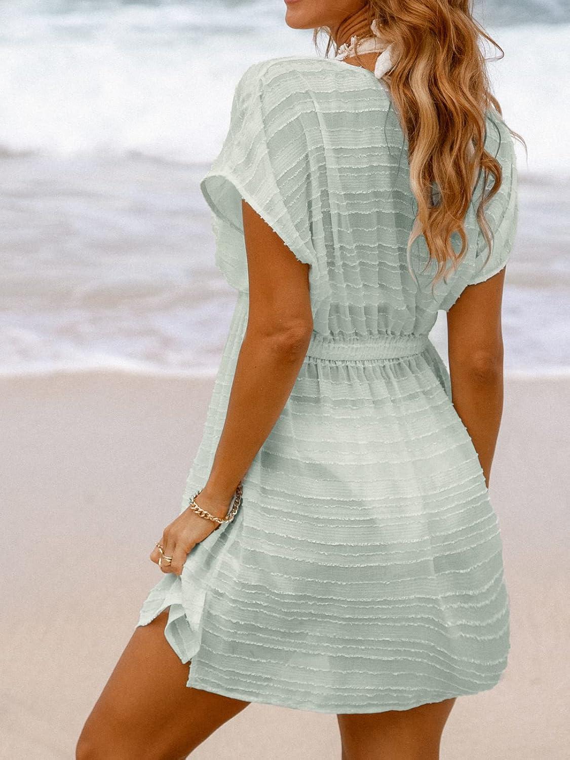 CUPSHE Women’s Swim Cover Up Dress V Neck Textured Striped Short Sleeve Cover Ups Casual Beach Summer(Sage Green)