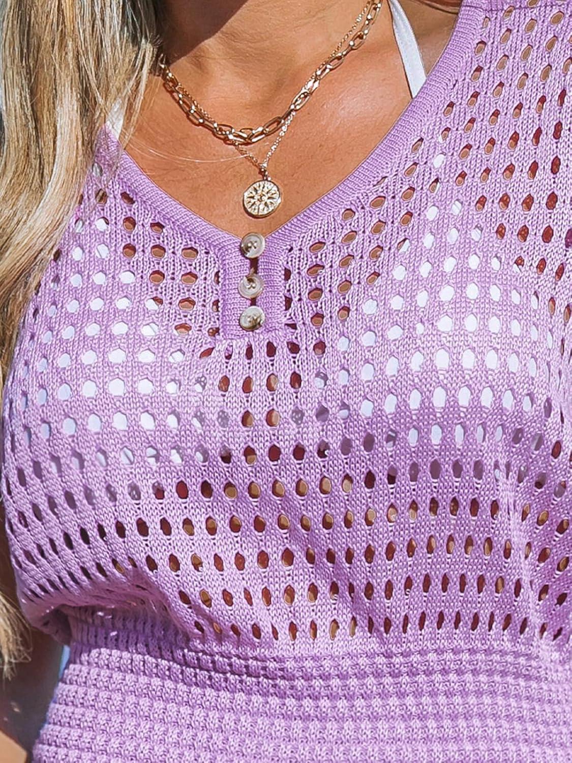 CUPSHE Women Crochet Swim Cover Up Short Sleeve V Neck Bathing Suit Beach Dress Summer Swimwear Coverups(Purple)