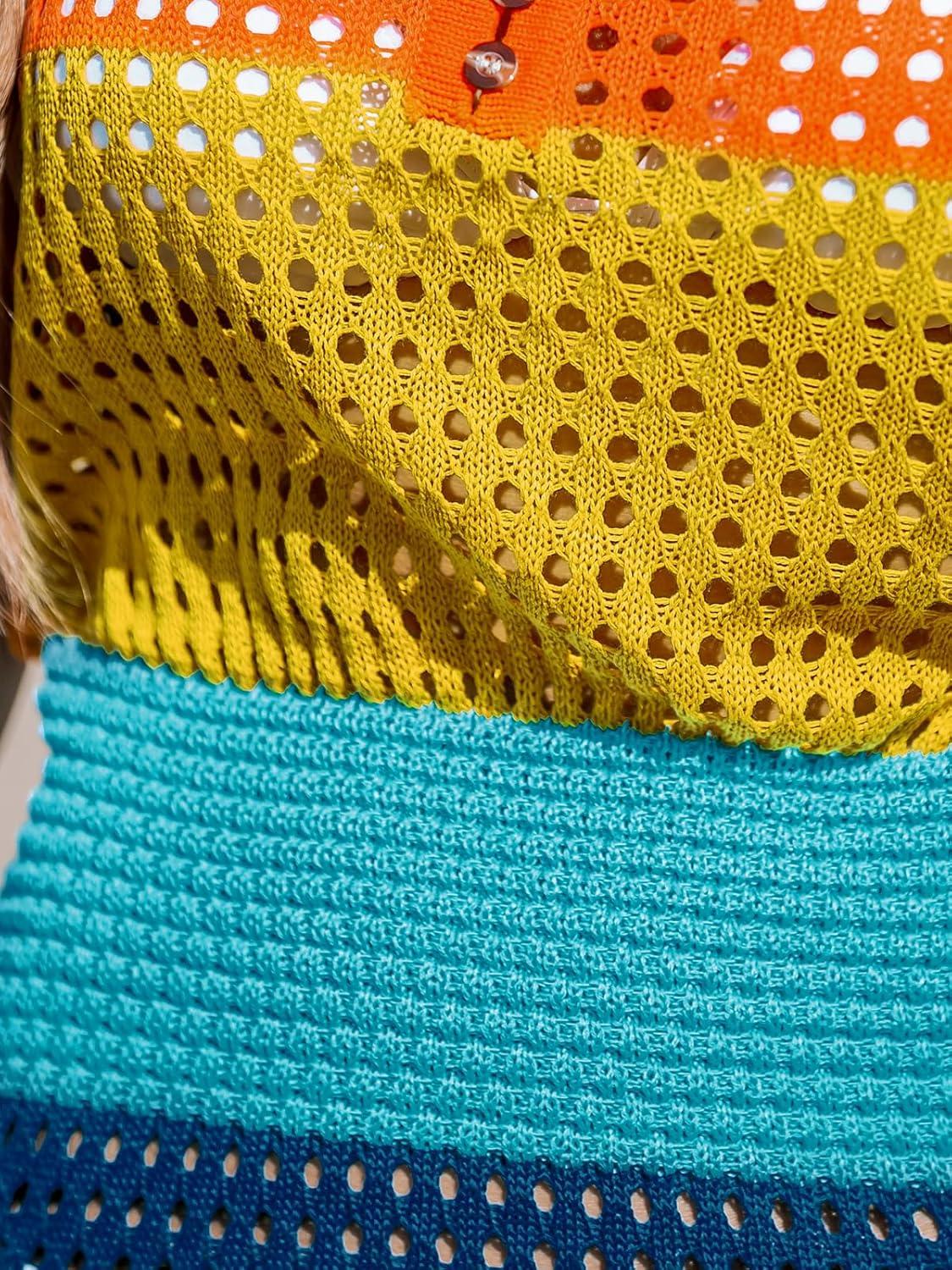 CUPSHE Women Crochet Swim Cover Up Short Sleeve V Neck Bathing Suit Beach Dress Summer Swimwear Coverups(Rainbow Colorblock)