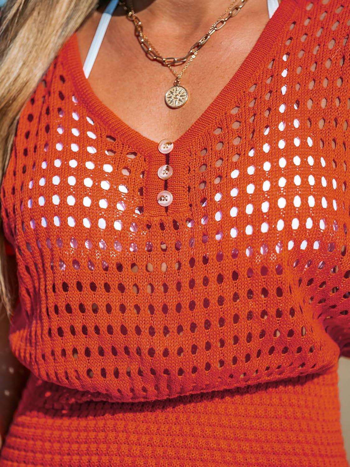 CUPSHE Women Crochet Swim Cover Up Short Sleeve V Neck Bathing Suit Beach Dress Summer Swimwear Coverups(Red Orange)