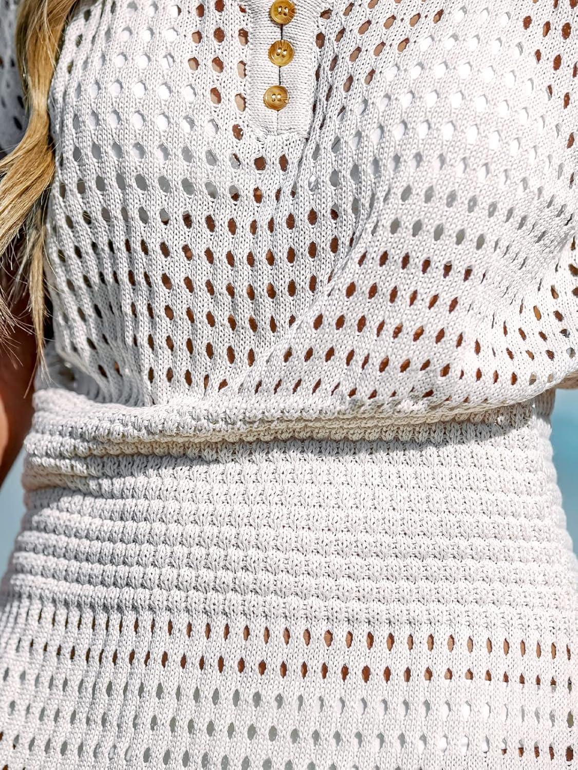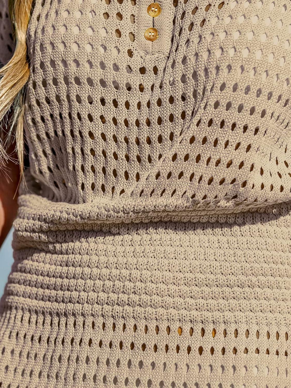 CUPSHE Women Crochet Swimsuit Cover Up Set Long Sleeve 2 Piece Summer Bathing Suit Beach Outfit(Khaki)