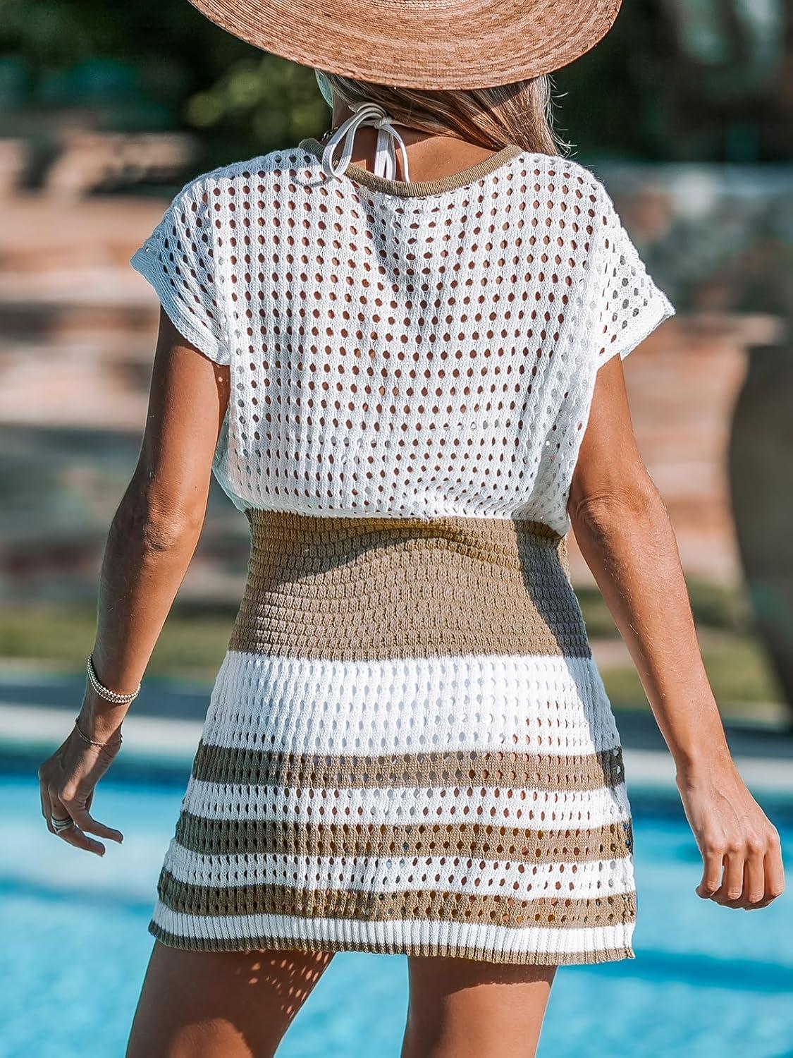 CUPSHE Women Crochet Swim Cover Up Short Sleeve V Neck Bathing Suit Beach Dress Summer Swimwear Coverups(Striped Brown)