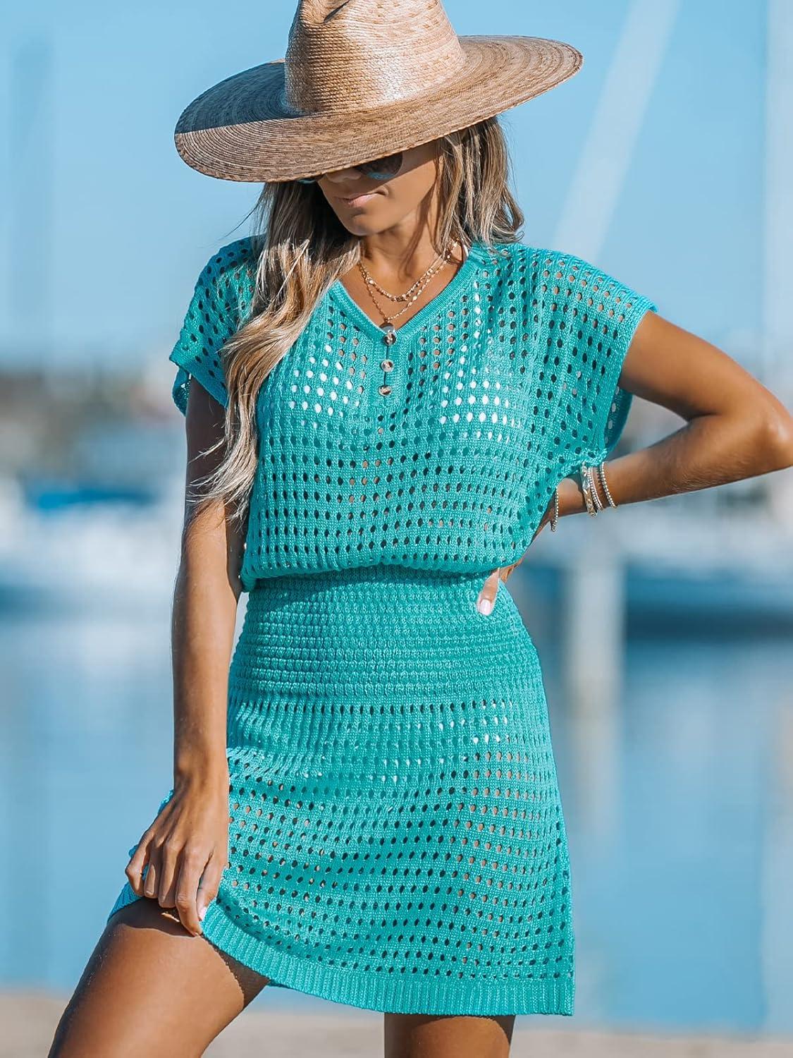 CUPSHE Women Crochet Swim Cover Up Short Sleeve V Neck Bathing Suit Beach Dress Summer Swimwear Coverups(Turquoise)