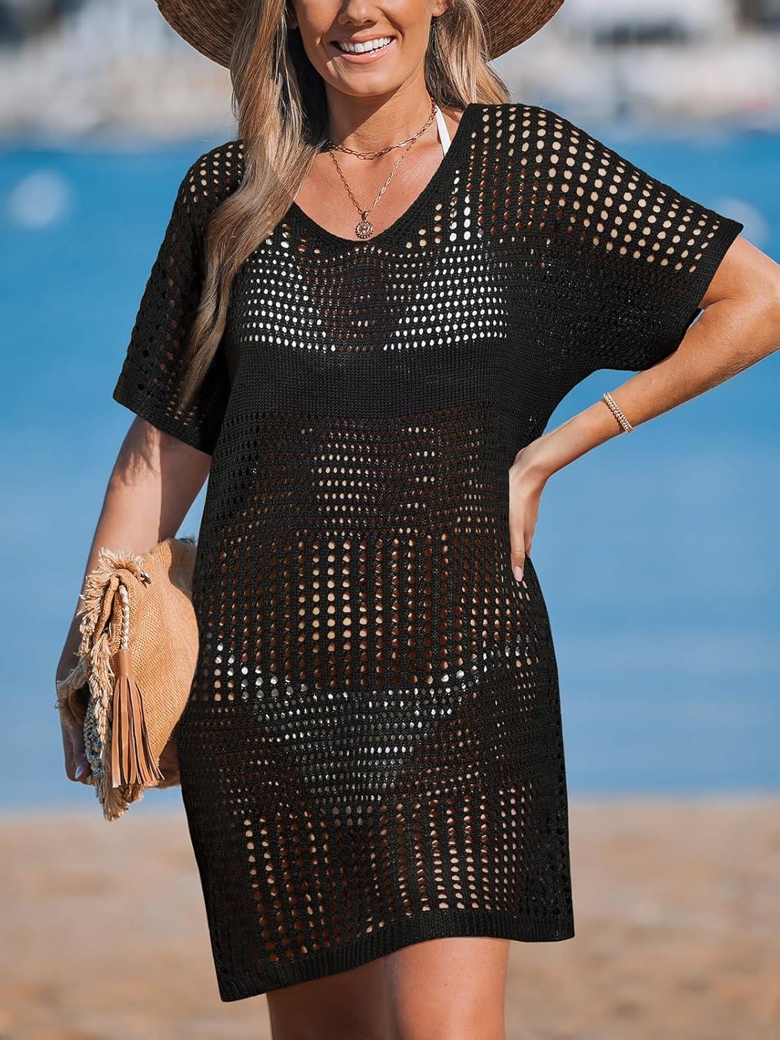 CUPSHE Women Crochet Swimsuit Cover Up Short Sleeve Beach Dress V Neck Bathing Suit Coverups for Beach Swimwear(Black)