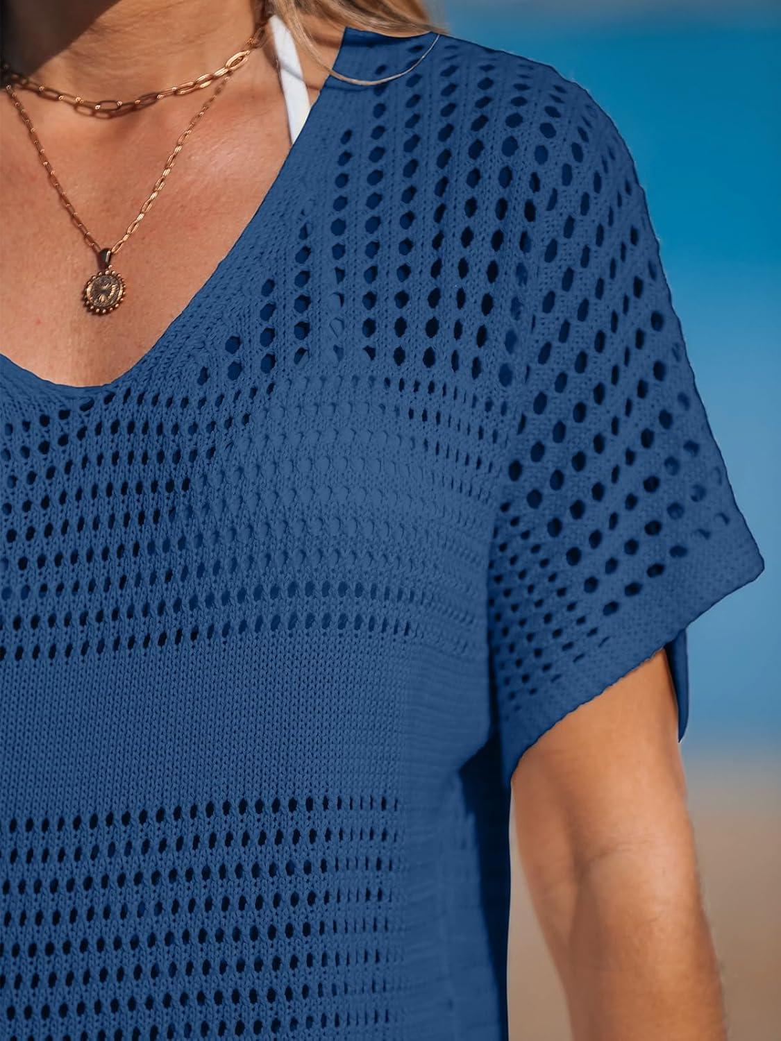 CUPSHE Women Crochet Swimsuit Cover Up Short Sleeve Beach Dress V Neck Bathing Suit Coverups for Beach Swimwear(Navy)